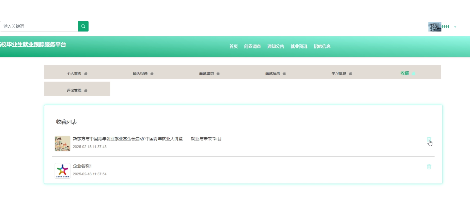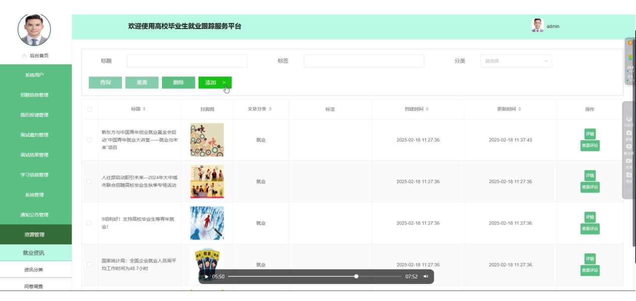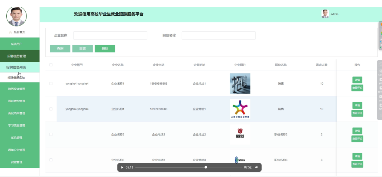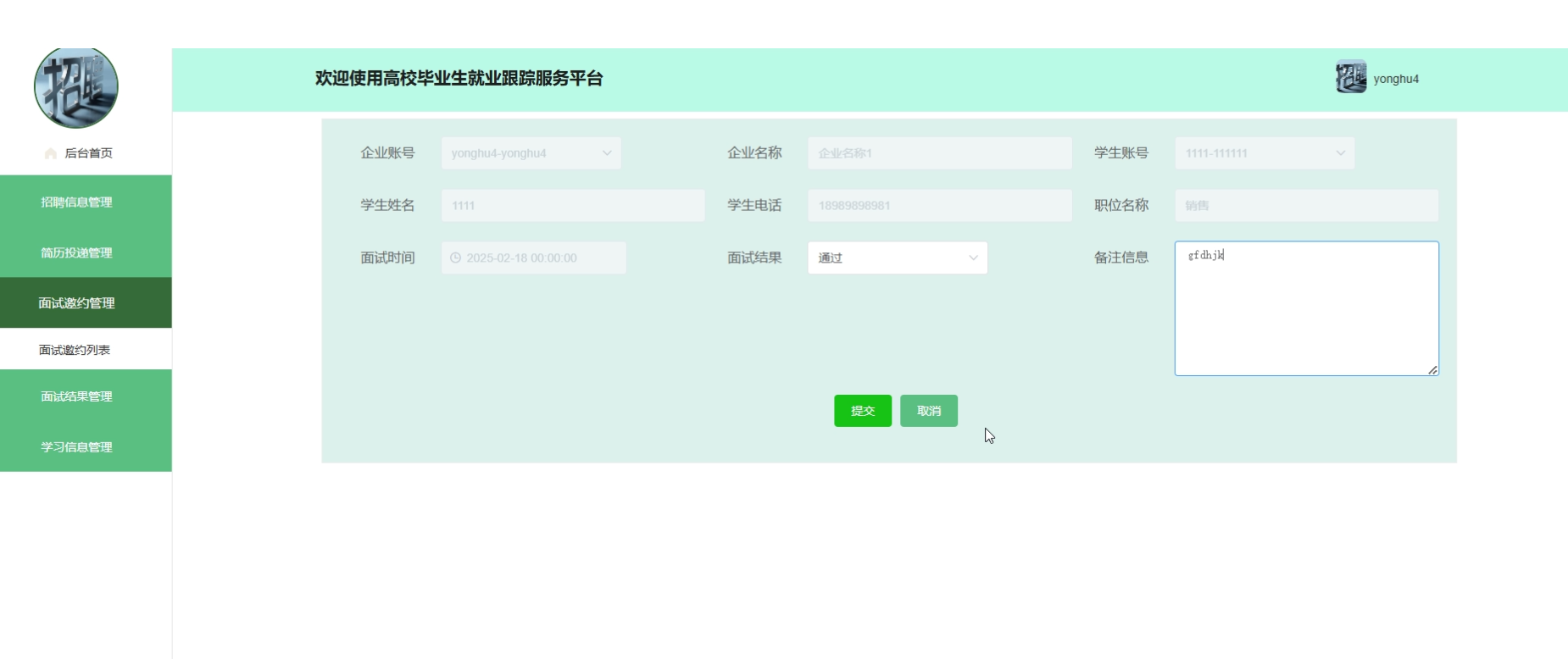 Administrator users have comprehensive management privileges, control various user information through system user management, manage recruitment information to ensure accurate and compliant content, grasp delivery dynamics through resume delivery management, coordinate interview invitations and result management to promote the interview process, pay attention to the learning situation of students in learning information management, maintain stable operation of the platform through system management, timely release important messages through notification and announcement management, and implement resource management to allocate platform resources; Enterprise users can manage recruitment information to publish and update job positions, participate in resume submission management to screen suitable resumes, execute interview invitation management to send invitations to candidates, process interview results management to provide feedback on interview situations, and also use learning information management to provide relevant learning resources or suggestions for students; Student users can browse the platform overview on the homepage, obtain important news in the notification and announcement section, learn about employment trends and other information in the employment information section, view and operate recruitment information. The personal center has rich functions, which can display personal information through the personal homepage, use the resume submission function to submit job resumes, receive interview invitations and view interview results, manage learning information to improve themselves, and also have a collection function to save interested content and comment management to express opinions on relevant information.