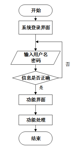 用户首先进入系统登录界面,输入用户名和密码后,系统验证信息是否正确。若验证失败,返回登录界面重新输入;若验证成功,则进入功能界面,执行相应功能处理后结束操作流程。操作流程如图3-5所示。