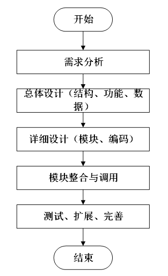 系统开发流程的主要步骤,从需求分析到系统完成的全过程。流程包括需求分析、总体设计(结构、功能、数据)、详细设计(模块、编码)、模块整合与调用,以及测试、扩展和完善,最终完成系统的开发。本系统的开发流程如图3-3所示