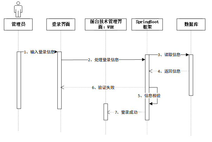 管理员输入登录信息后,登录界面将信息传递至前台管理界面,随后通过SpringBoot框架读取数据库中的用户信息并返回。系统验证信息,若验证成功则登录成功,若验证失败则返回错误提示。登录时序图如图4-4所示。