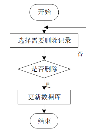 用户选择需要删除的记录后,系统判断是否确认删除。若未确认,返回选择环节;若确认删除,则更新数据库,删除对应记录,完成操作后流程结束。删除信息流程图如图3-8所示。