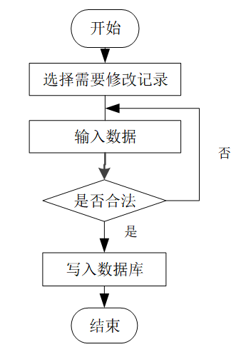 用户首先选择需要修改的记录,输入修改后的数据,系统判断输入数据是否合法。若数据不合法,提示重新输入;若数据合法,则将修改后的数据写入数据库,完成操作后流程结束。修改信息流程图如图3-7所示。