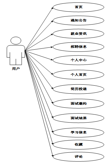 学生用户可查看高校毕业生就业信息,包括首页、通知公告、就业资讯、招聘信息、 个人中心(个人首页 、简历投递 、面试邀约 、面试结果 、学习信息 、收藏、评论管理)等功能;用户用例图如图3-1所示。