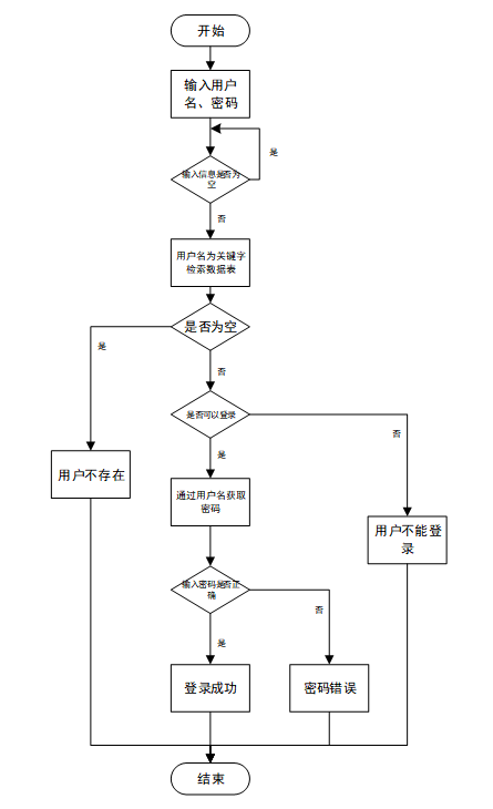 用户输入用户名和密码后,系统先检查输入是否为空,再验证用户名是否存在,若存在则通过用户名获取密码并校验。若密码正确则登录成功,否则提示密码错误。若用户名不存在或无法登录,提示用户操作无效。如图3-4所示。