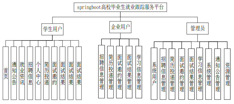 管理员用户拥有全面管理权限,通过系统用户管理把控各类用户信息,进行招聘信息管理以确保内容准确合规,借助简历投递管理掌握投递动态,统筹面试邀约及结果管理以推进面试流程,关注学习信息管理中学生的学习情况,通过系统管理维护平台稳定运行,利用通知公告管理及时发布重要消息,并实施资源管理调配平台资源;企业用户能够进行招聘信息管理来发布、更新招聘岗位,参与简历投递管理筛选合适简历,执行面试邀约管理向候选人发出邀请,处理面试结果管理反馈面试情况,还可利用学习信息管理为学生提供相关学习资源或建议;[2]学生用户可在首页浏览平台概览,在通知公告板块获取重要消息,于就业资讯板块了解就业趋势等信息,查看招聘信息并进行操作,个人中心功能丰富,可通过个人首页展示个人信息、使用简历投递功能投递求职简历、接收面试邀约并查看面试结果、进行学习信息管理以提升自身,还有收藏功能保存感兴趣内容以及评论管理对相关信息发表看法 。