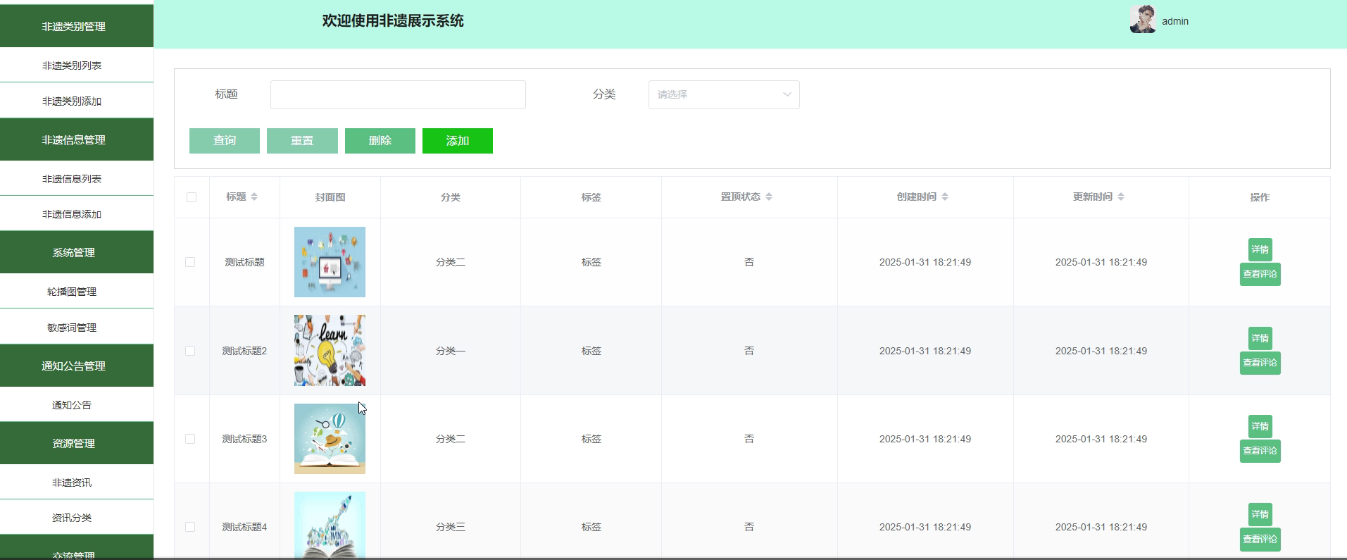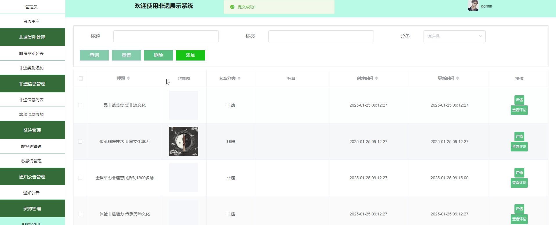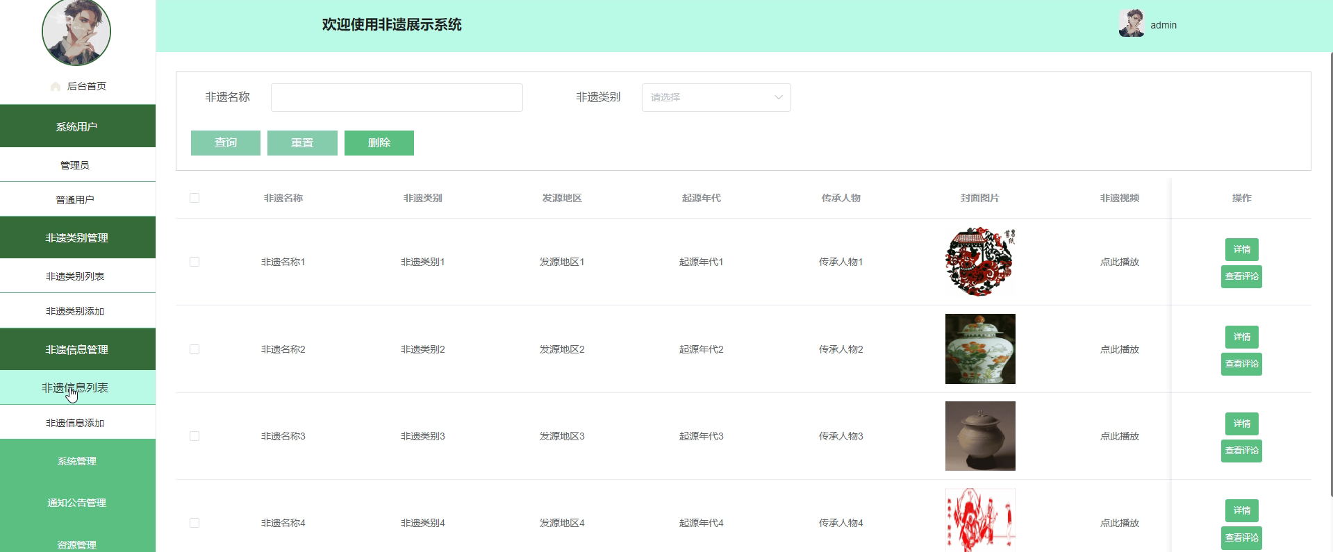 (4)非遗信息管理:管理员可以在此模块对非遗信息进行增删改查。