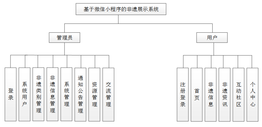 基于微信小程序的非遗展示系统主要划分了系统系统小程序端用户模块和系统后台管理员模块两大部分。以下是两大用户的具体功能详情分析: