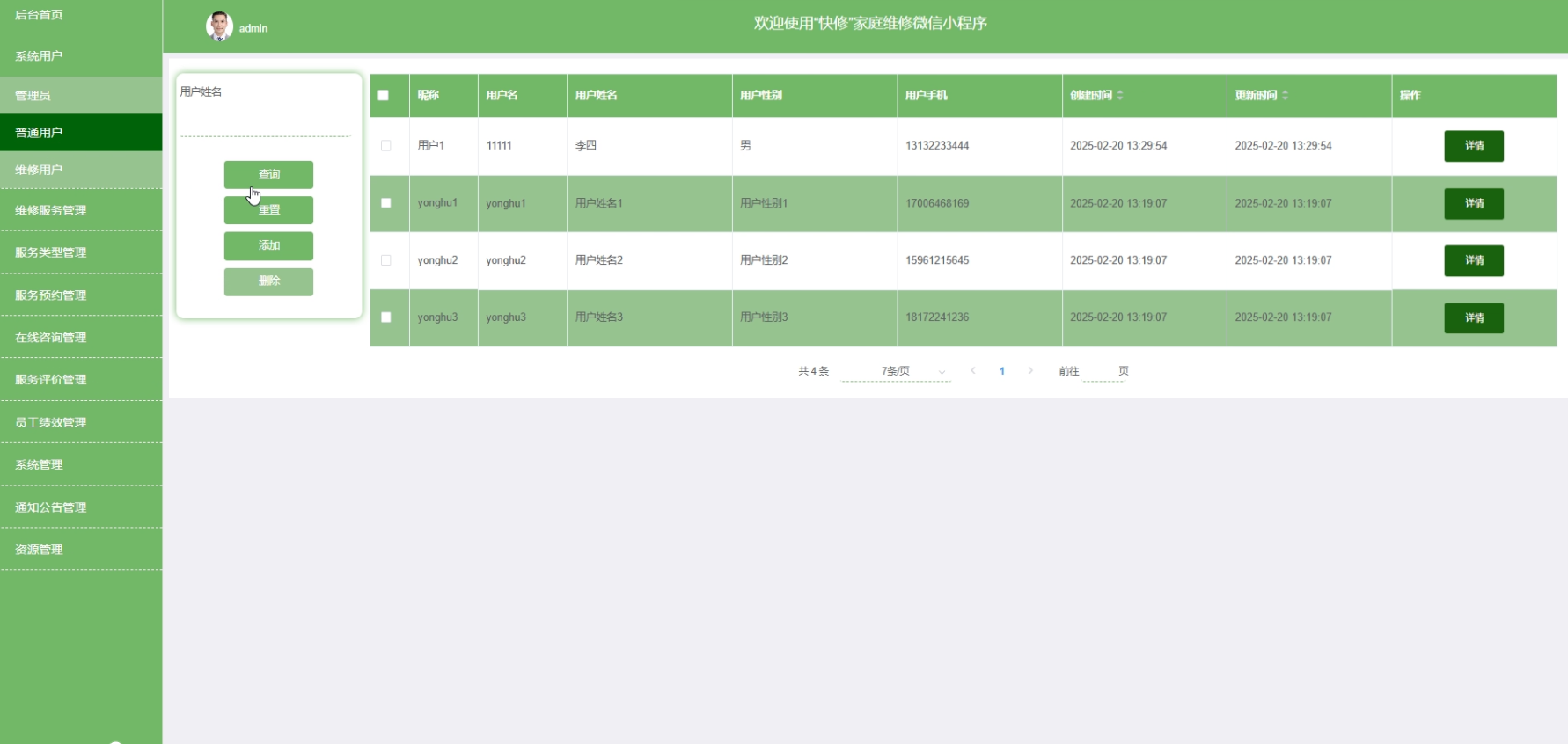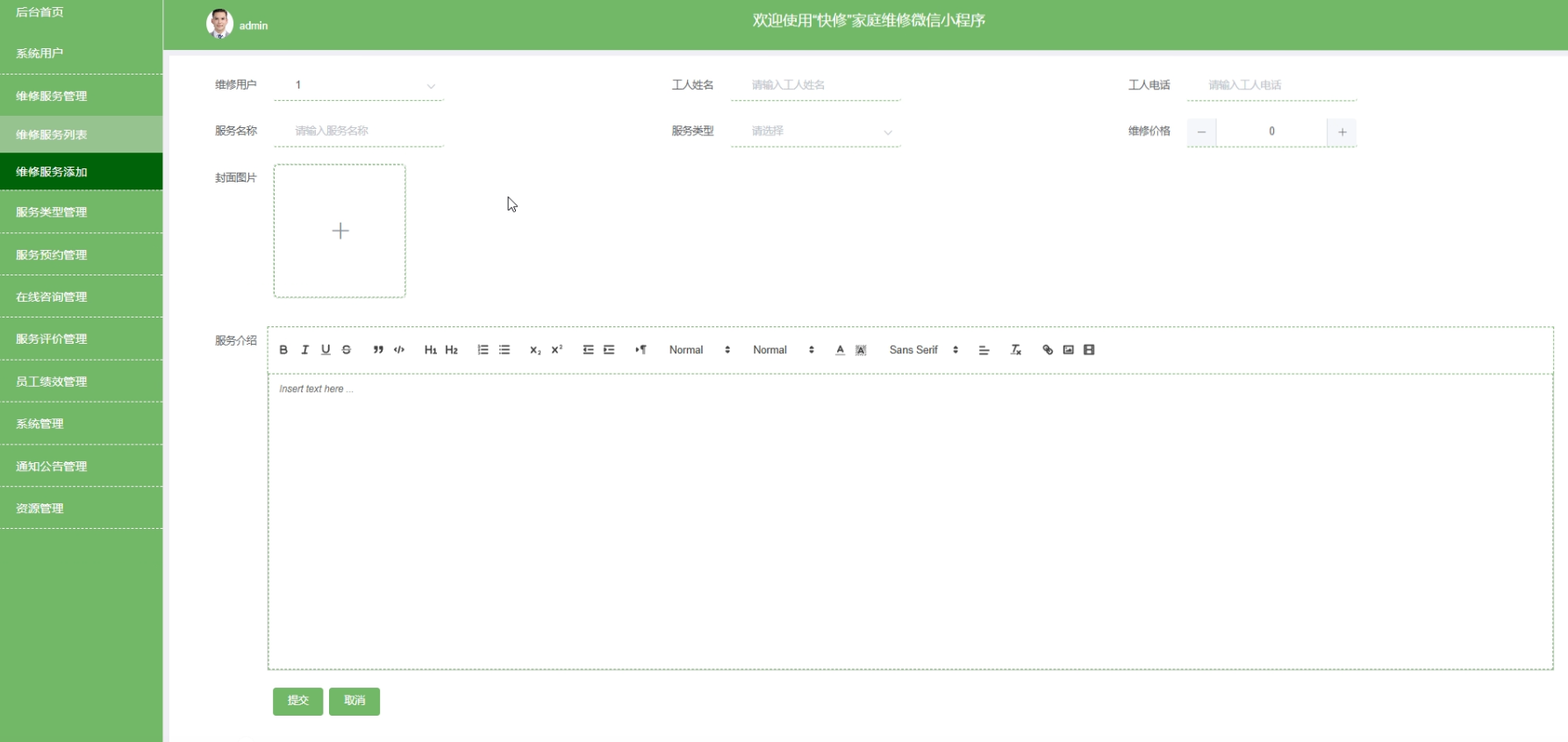| 用例描述 | 管理员正确登录后台管理的条件下,对维修服务模块进行管理 |