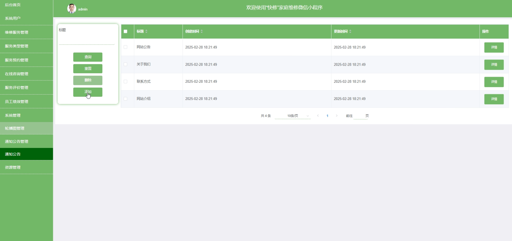 | 用例描述 | 管理员正确登录后台管理的条件下,维修反馈模块进行管理 |