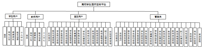 三、功能模块设计:高校学生医疗咨询平台主要包含学生用户、教师用户、医生用户和管理员四大模块。学生用户模块涵盖首页浏览、网站公告查看、健康资讯阅读、医生信息查询以及个人中心管理等功能,全方位满足学生日常医疗咨询与健康管理需求。教师用户模块功能与学生类似,但个人中心更侧重于教师的预约、签到、咨询、医嘱查看、请假申请、反馈提交及收藏评论管理等,贴合教师群体特点。医生用户模块则聚焦于后台管理,包括医生信息维护、各类预约与签到管理、咨询与医嘱处理、请假与病假审批、反馈管理以及排班班表安排等,助力医生高效开展医疗咨询工作。管理员模块则负责整个平台的系统用户管理、科室与医生信息审核、预约与签到监督、咨询与医嘱跟踪、请假与病假把控、反馈汇总以及系统宣传推广等全方位运营管理任务,确保平台稳定、有序运行,为高校师生提供持续优质的医疗咨询服务。