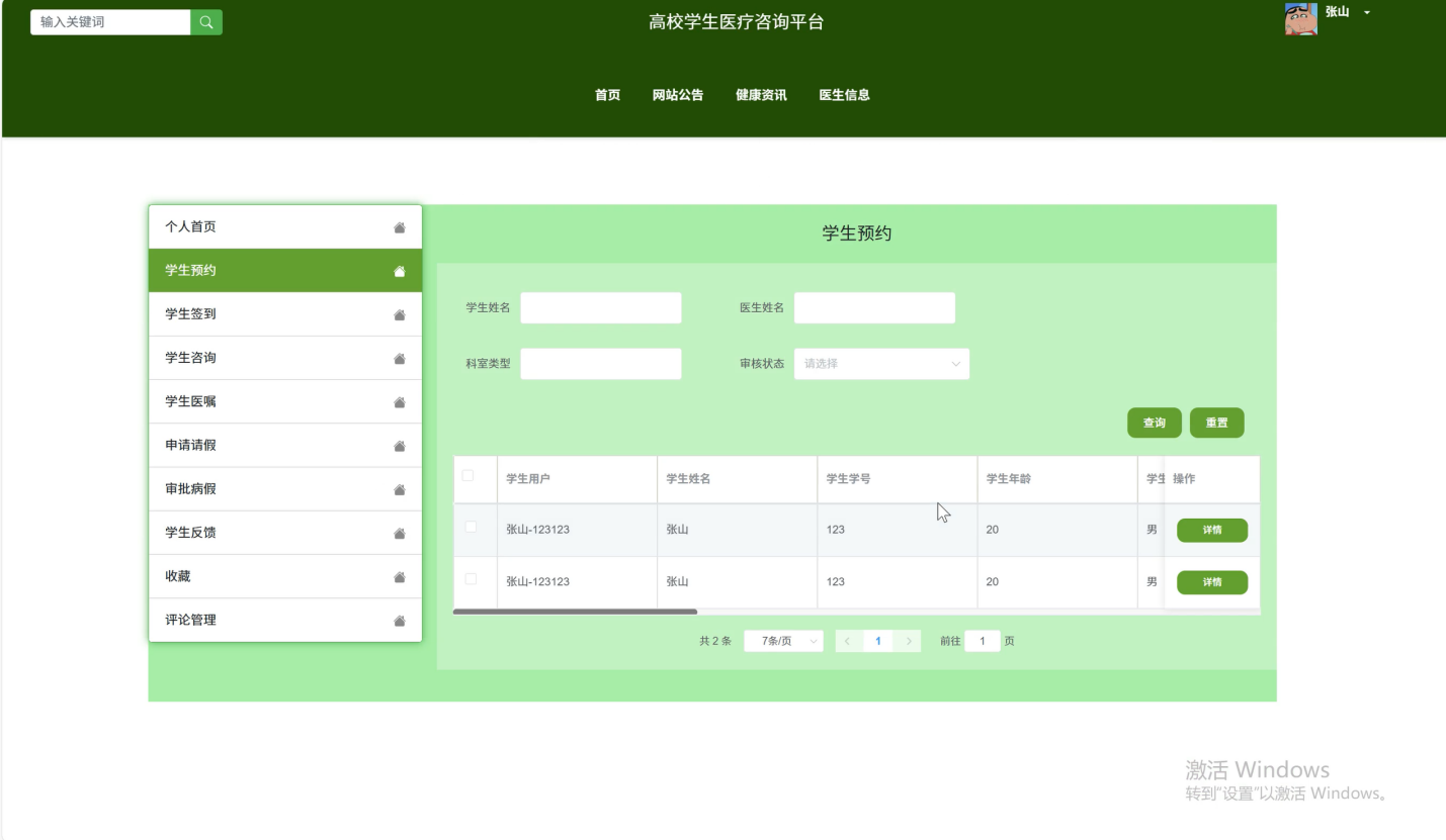 学生预约管理:从系统层面监督学生预约流程,处理异常预约情况,统计分析学生预约数据,为优化医疗资源配置提供依据。