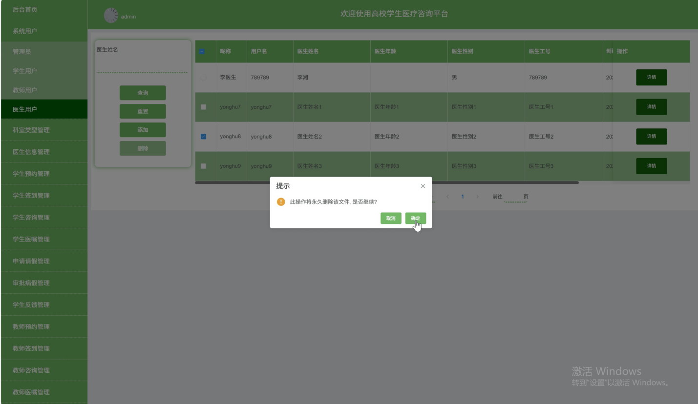 医生信息:查看医生的专业背景、擅长领域、出诊时间等信息,帮助学生选择合适的医生进行咨询。
