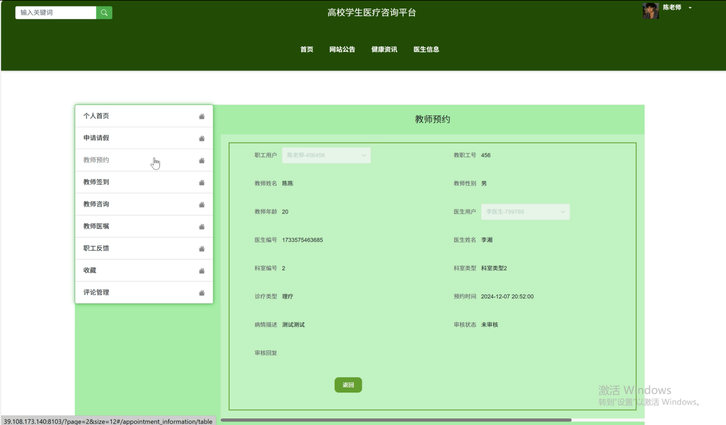 Its core functional modules include student users, teacher users, doctor users, and administrator modules. Student users can obtain key medical information through the homepage, learn about campus medical trends based on website announcements, read health information to improve their health literacy, query doctor information to select appropriate medical services, and complete operations such as appointment, check-in, consultation, medical advice viewing, leave application approval, feedback, collection, and comment management in the personal center. Teacher users can access medical information and services on the homepage and related modules, and handle matters such as leave applications, appointment appointments, consultation with doctors, viewing medical orders, feedback, data collection, and comment management in the personal center. Doctor users can control their work priorities on the backend homepage, achieving functions such as doctor information maintenance, student and teacher appointment and check-in management, consultation and medical advice processing, leave approval, feedback response, and scheduling arrangements. The administrator is responsible for the comprehensive management of system users, department classification settings, overall planning of medical resources, supervision of various business processes, and optimization of system display in the background, ensuring the stable operation of the platform and the improvement of service quality.