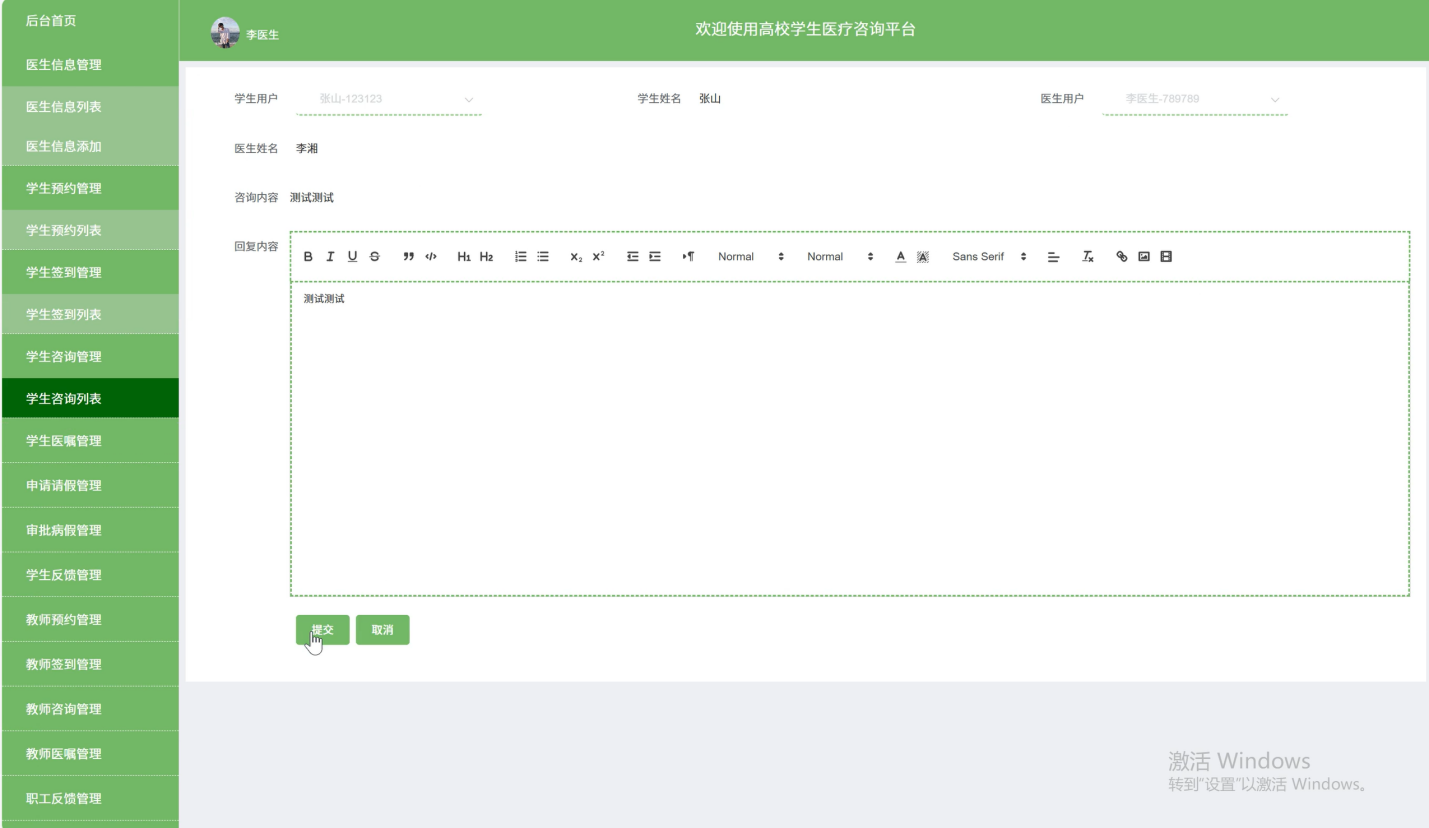 医生可以及时查看和回复学生的健康咨询问题,提供专业的医疗建议和解答,帮助学生解决健康疑惑,提升学生的健康意识和自我保健能力,同时也增强了医患之间的沟通和信任。界面如下图所示。