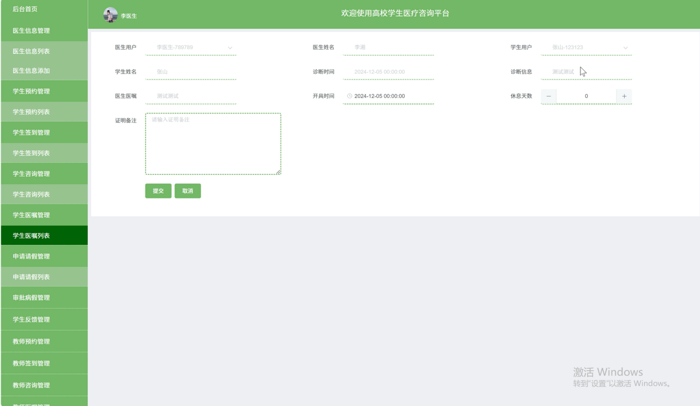 医生记录和管理为学生开具的医嘱,包括用药指导、康复建议等,确保学生能够准确执行医嘱,促进身体健康恢复,提高治疗效果。此外,医生还可以根据学生的反馈和病情变化,及时调整治疗方案和医嘱内容,实现精准医疗。界面如下图所示。