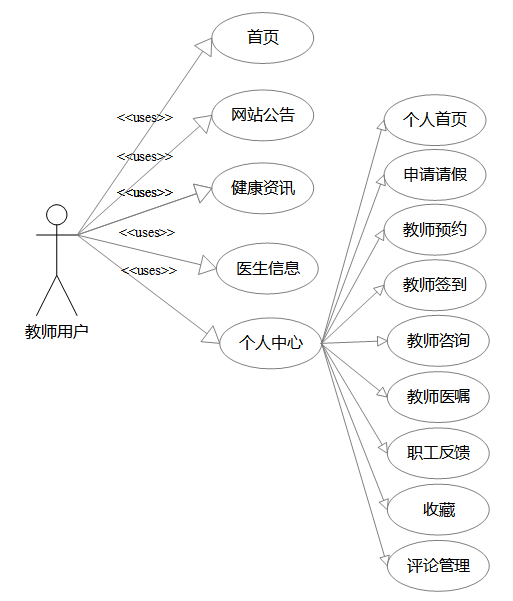 个人中心:教师可以管理个人信息,查看个人首页、申请请假、进行教师预约、教师签到、教师咨询、查看教师医嘱、提交职工反馈、收藏感兴趣的内容以及管理评论。