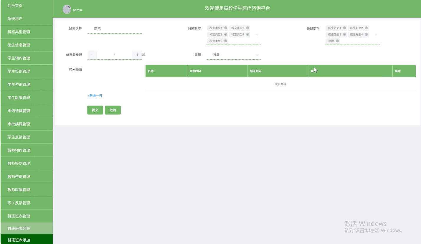 管理员能够合理安排医生的工作时间和休息时间,确保医疗服务的连续性和稳定性。这一功能对于优化医疗资源配置、提高医疗服务效率至关重要,同时也保障了医生的工作和休息权益,有助于维持医疗团队的高效运转和良好工作状态。界面如下图所示。