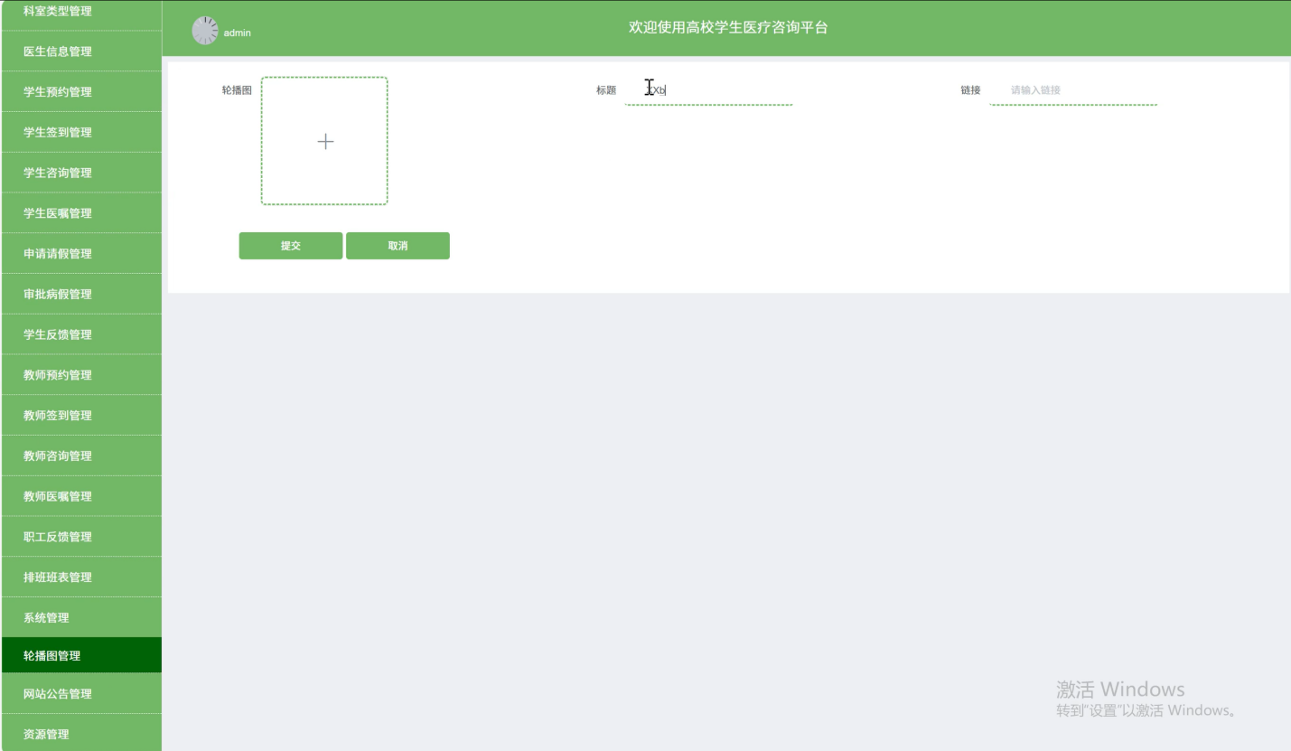系统管理:精心策划平台首页轮播图内容,聚焦校园医疗热点、季节性疾病预防、健康科普活动等信息,以图文并茂的形式吸引用户关注,提升平台信息传播效果。