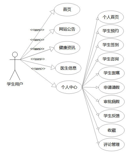 个人中心:学生可以管理个人信息,查看个人首页、进行学生预约、学生签到、学生咨询、查看学生医嘱、申请请假、审批病假、提交学生反馈、收藏感兴趣的内容以及管理评论。