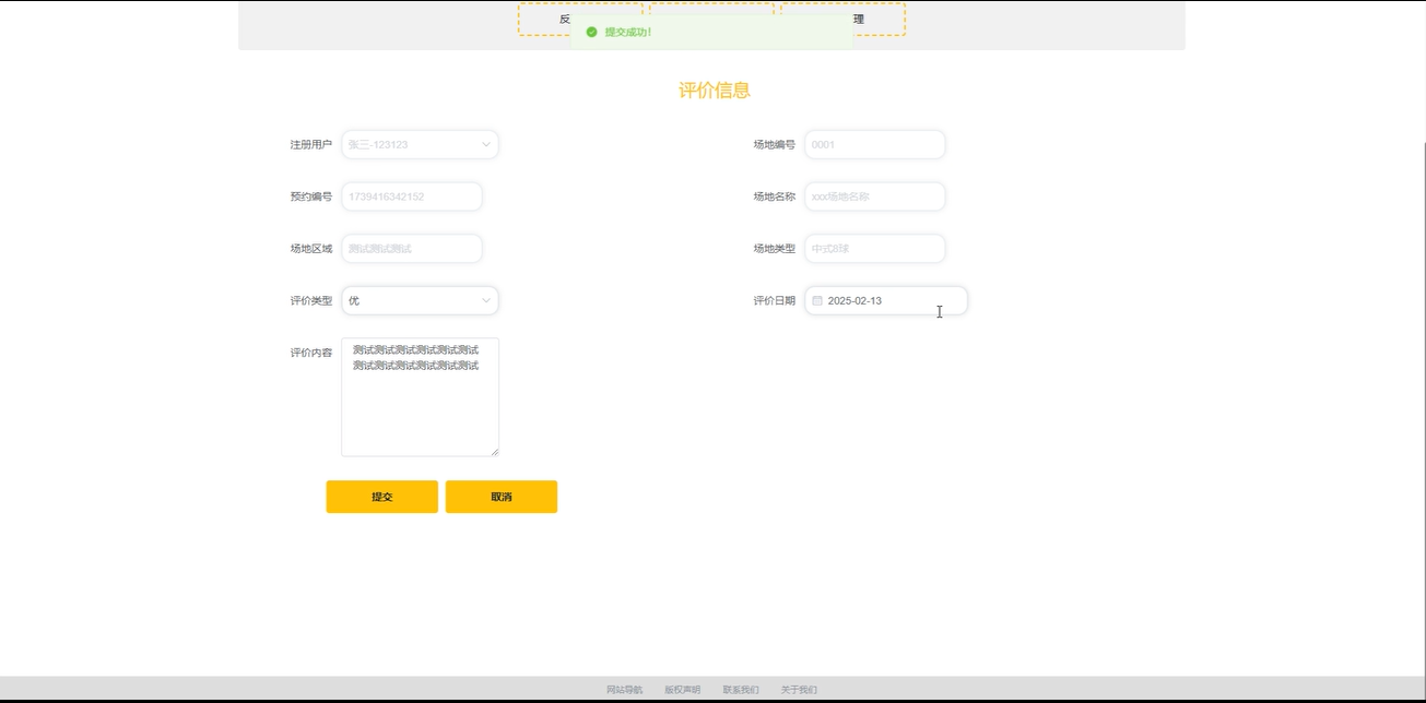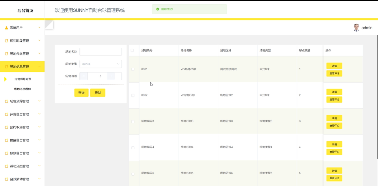 评价信息管理:管理员可以查看评价详情,支持输入场地名称、选择评价类型进行搜索、查询和删除,维护良好的评价环境。