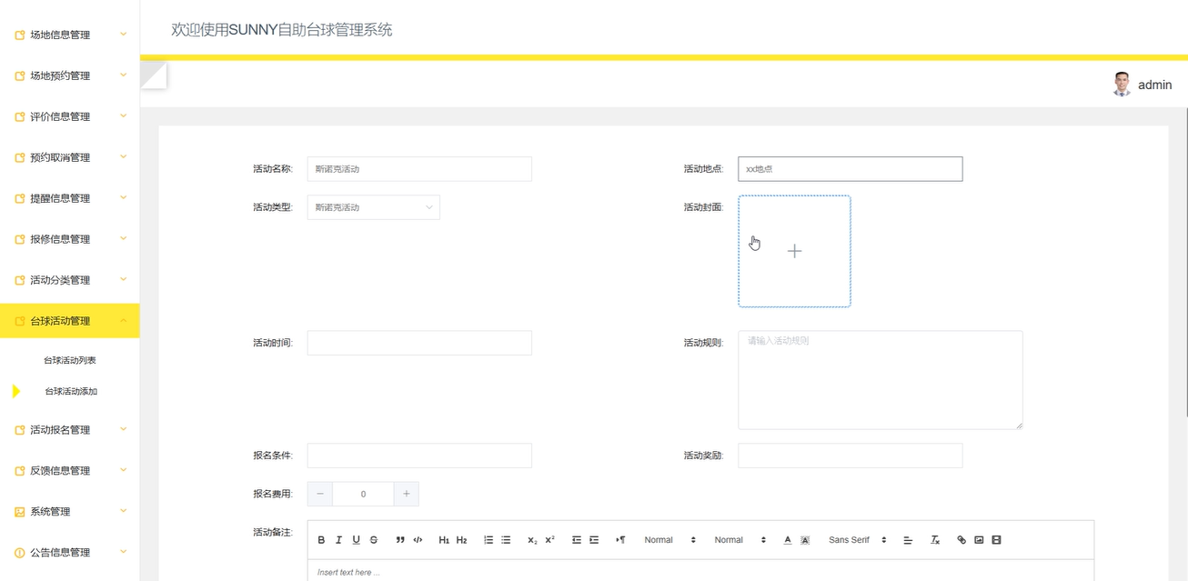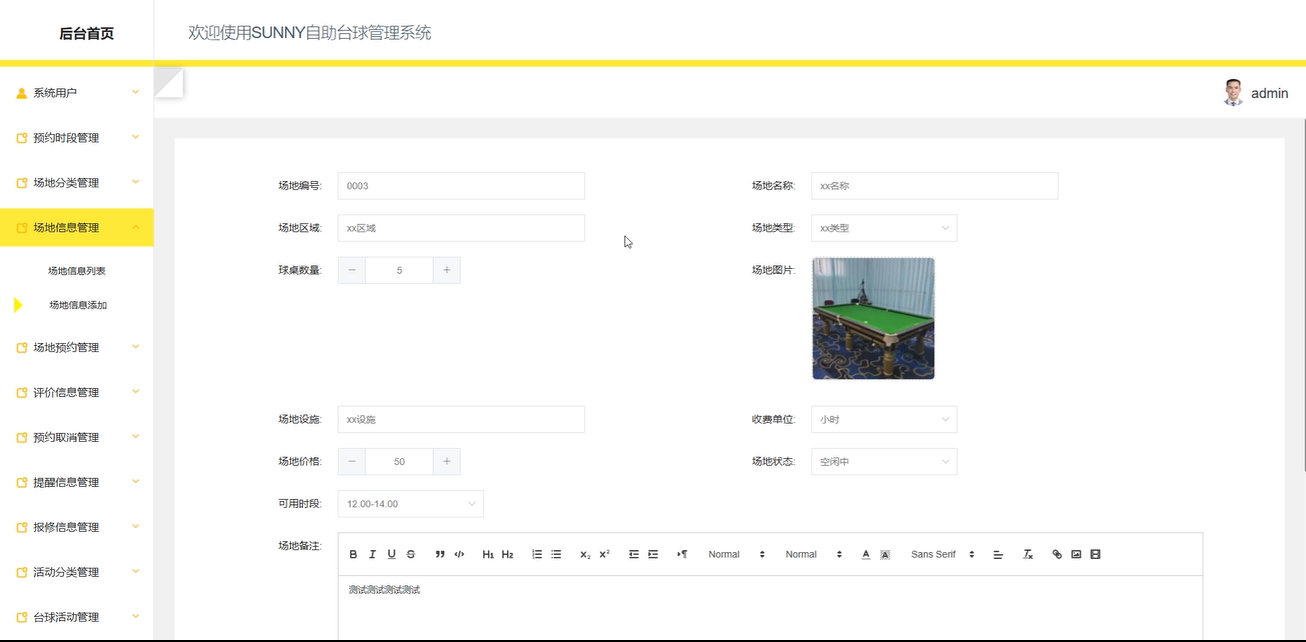 平台的设计强调便捷性和用户体验,提供了详细的场地信息和活动安排,满足了用户对台球娱乐的各类需求。同时,管理员通过后台管理界面,实现对系统数据的全面控制,能够进行场地、活动和用户的管理,优化平台的运营效率。Sunny自助台球管理系统通过精细化的功能设计,提升了台球场馆管理的智能化水平,使得用户和管理员之间的互动更加顺畅,为台球爱好者提供了更加高效和便捷的服务。