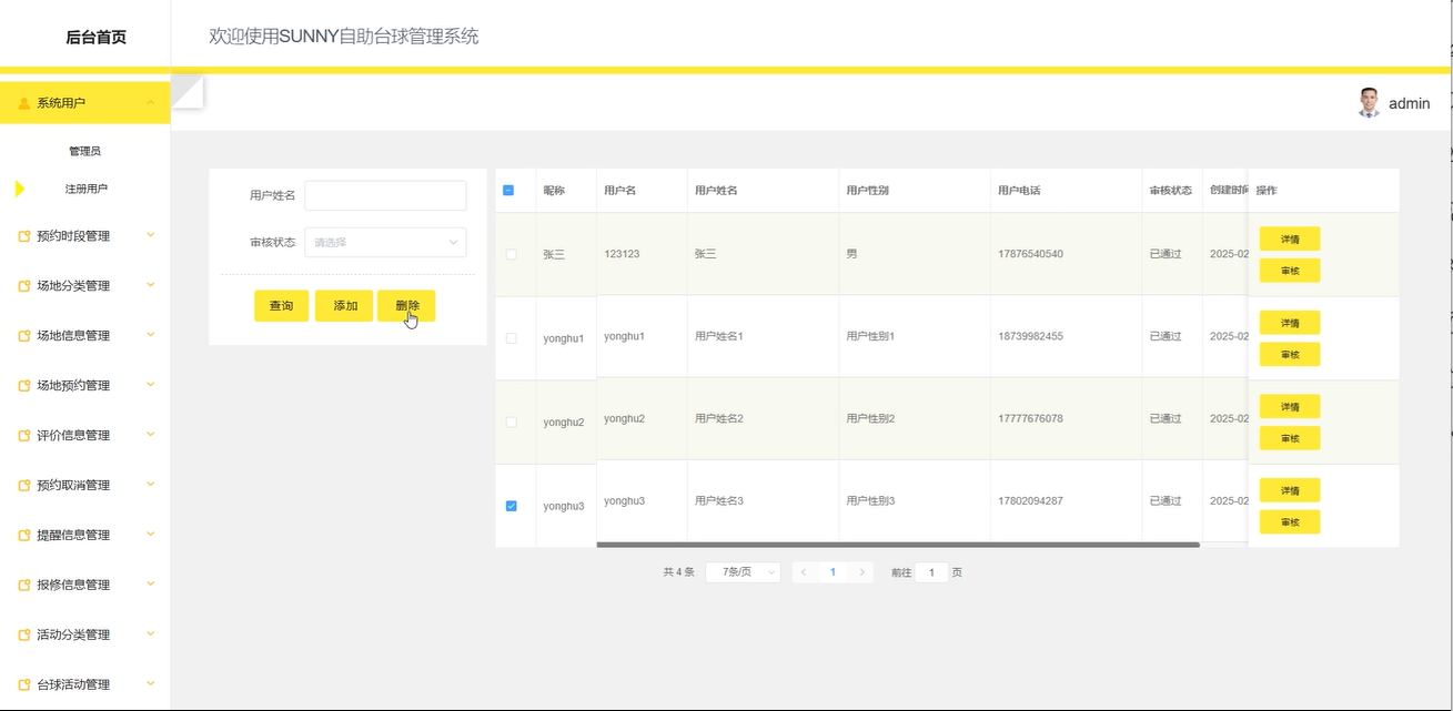 系统用户:管理员可以管理用户账号详情并进行审核,支持输入用户姓名、选择审核状态进行查询、添加、删除等操作,确保系统用户的真实性和有效性。