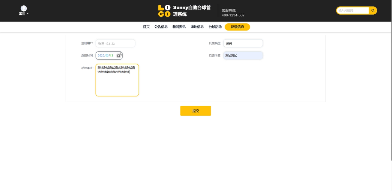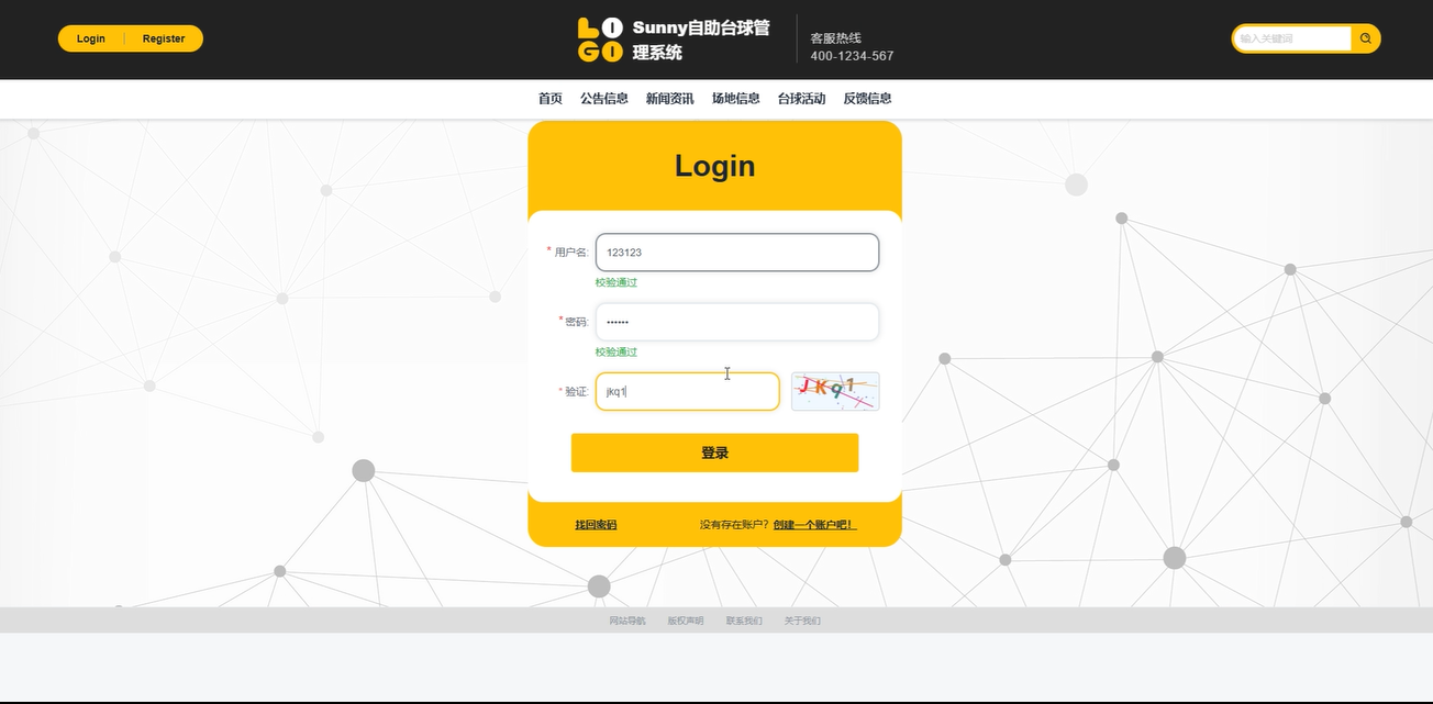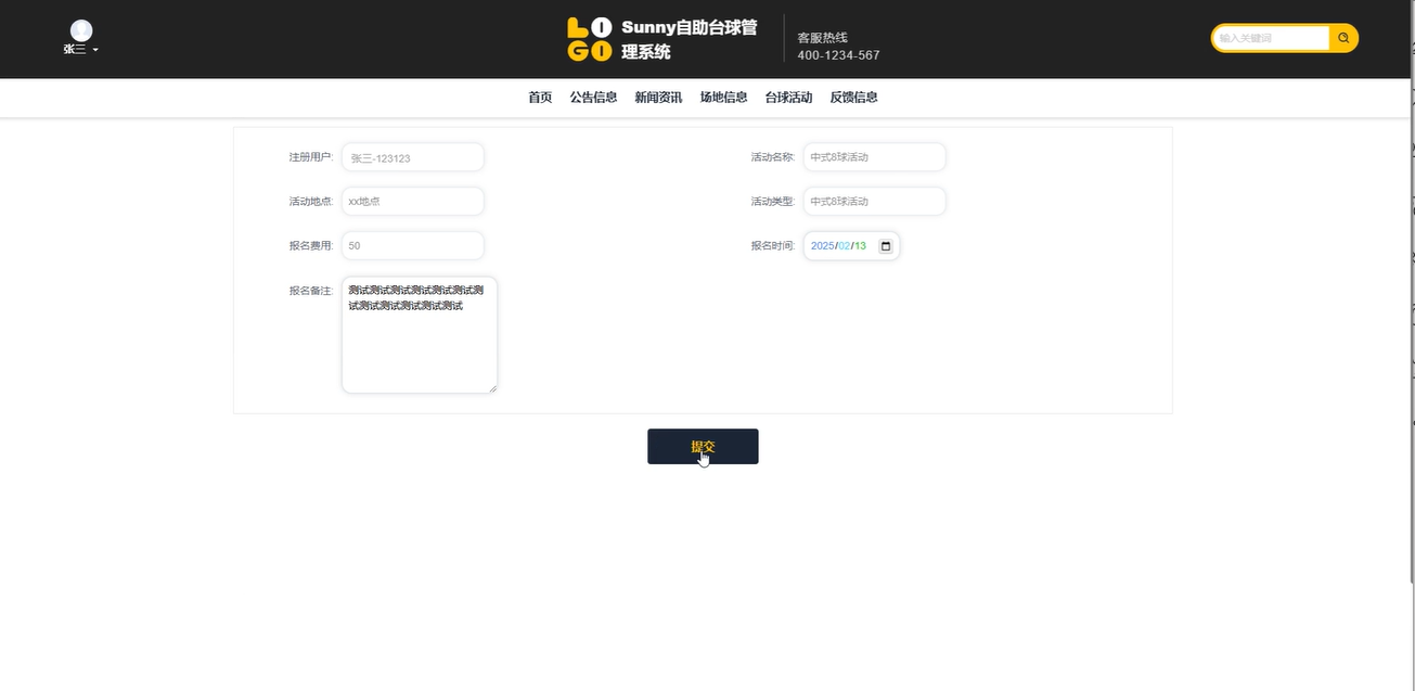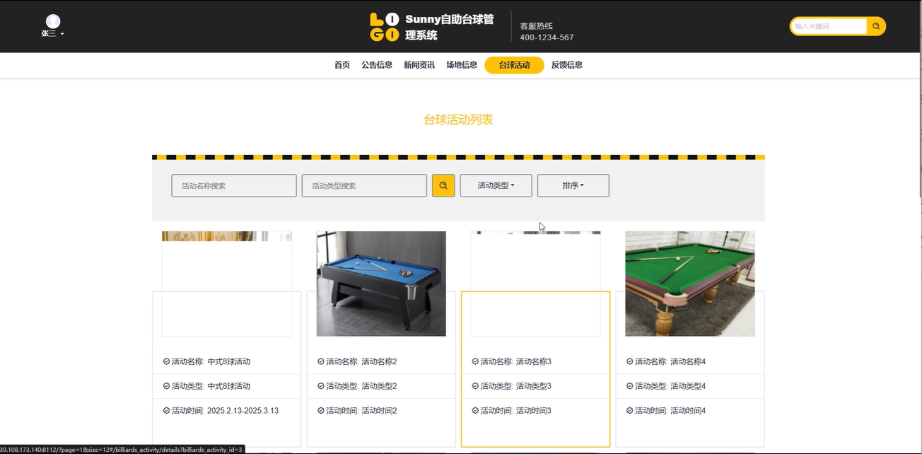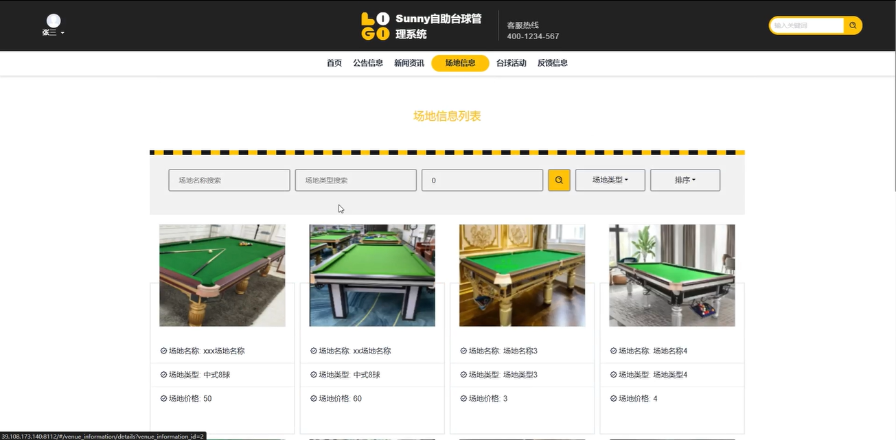 Sunny Self service Billiards Management System is a management platform developed based on the Springboot framework, aimed at providing a comprehensive solution for booking and managing billiard courts and events. The system is divided into two roles: registered user and administrator, each providing different functional modules. Registered users can browse venue information, billiards activities, make online reservations, register for activities, submit feedback information, and other operations through the platform. The platform also supports users to view news and information, comment management, activity reminders, and other functions, ensuring that users can easily and quickly manage their personal accounts and billiards activity needs. Administrators are mainly responsible for managing key content such as user information, venue data, and activity classification in the system. Administrators can review user accounts, maintain venue reservation times, manage detailed information about billiards activities, process user reviews, feedback, and repair requests.