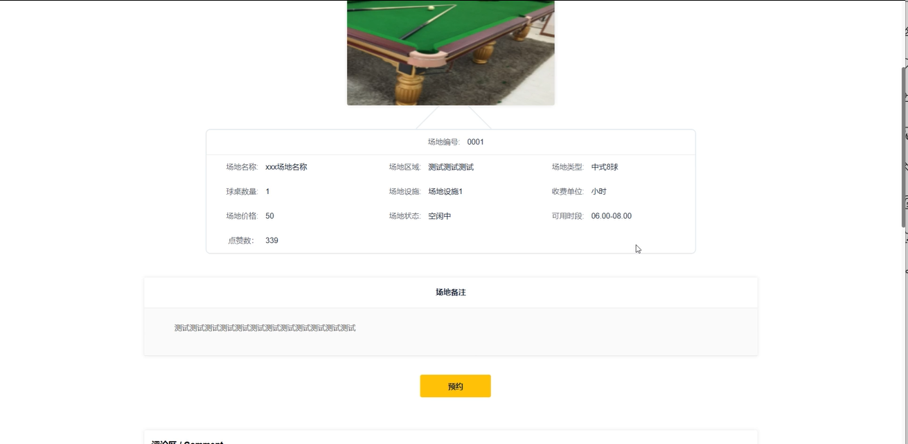 场地信息管理:管理员可以查看场地信息详情和用户评论,支持输入场地名称、选择场地类型及价格进行搜索、查询和删除;可以添加新场地信息,包括编号、名称、区域、类型、球桌数量、收费单位及设施等,设置用户预约限制。