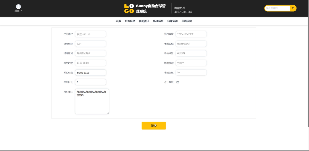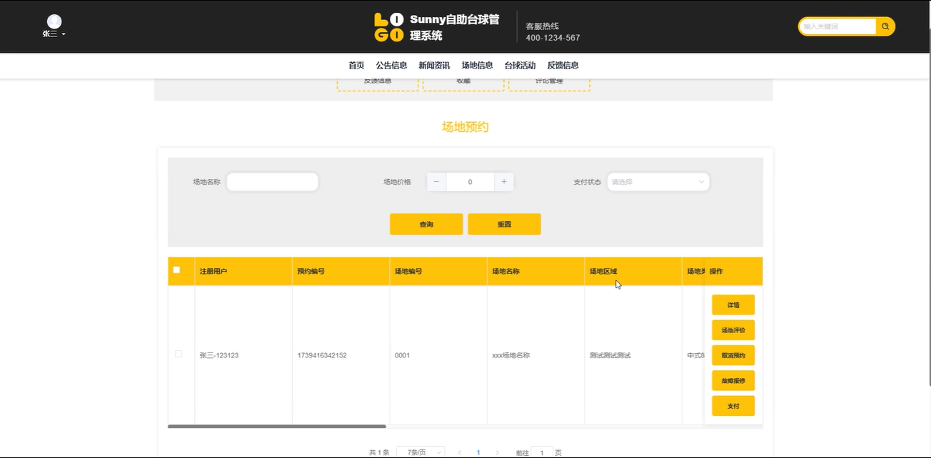 场地预约:用户可以查看前台预约的场地信息详情并进行评价、取消预约、故障报修和支付等操作,支持输入场地名称、场地价格及选择支付状态进行搜索、查询和重置。