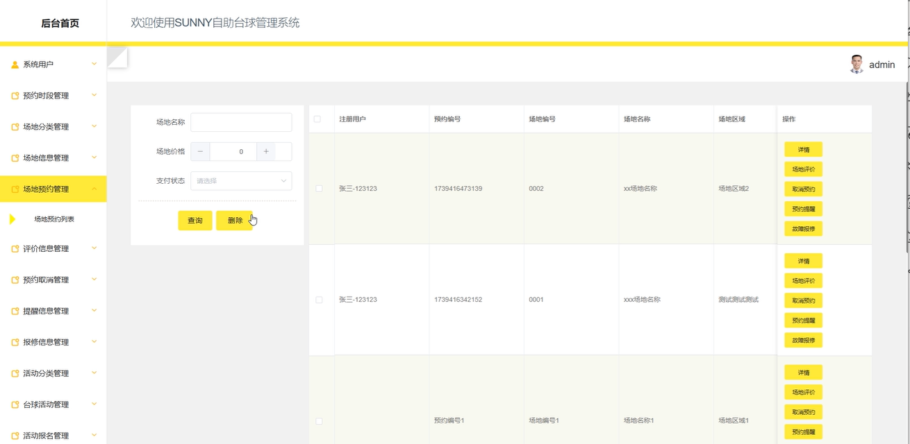 场地预约管理:管理员可以查看场地预约详情和场地评价、取消预约、预约提醒、故障报修详情,支持输入场地名称、价格及选择支付状态进行搜索、查询和删除。