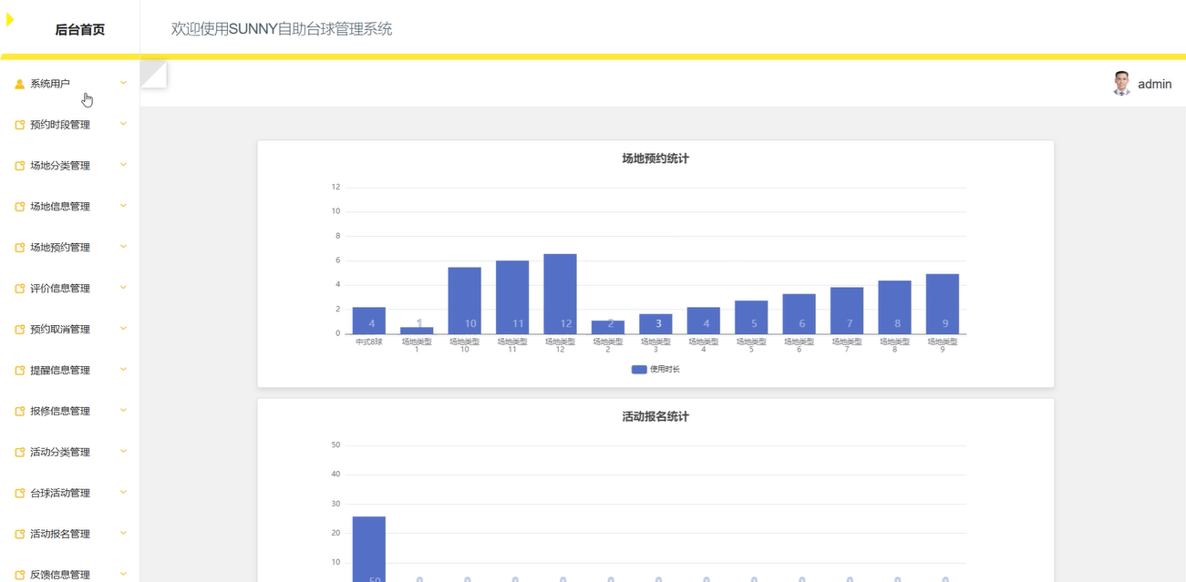 后台首页:管理员可以查看场地预约统计、活动报名统计图表,同时支持修改个人资料和登录密码,确保账号安全。