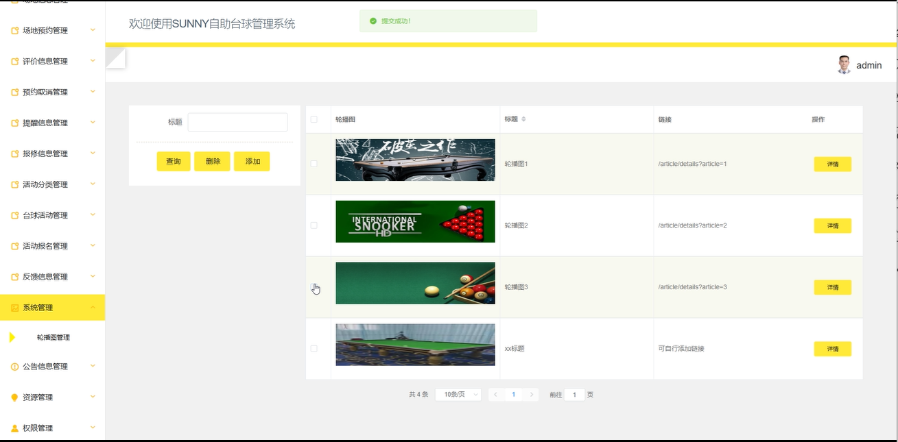 系统管理:管理员可以管理轮播图,查看各轮播图信息详情,支持通过输入标题进行搜索、对页面查询、删除、添加等操作;可以上传轮播图,输入标题和链接进行新增轮播图操作。