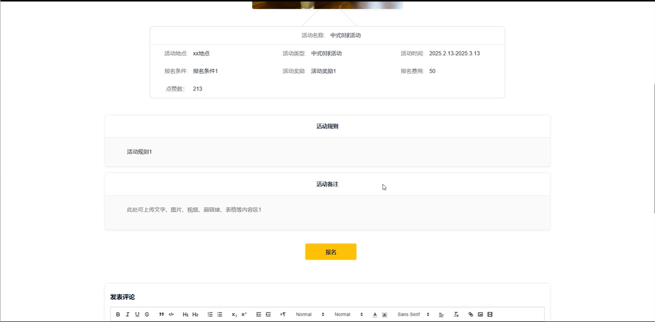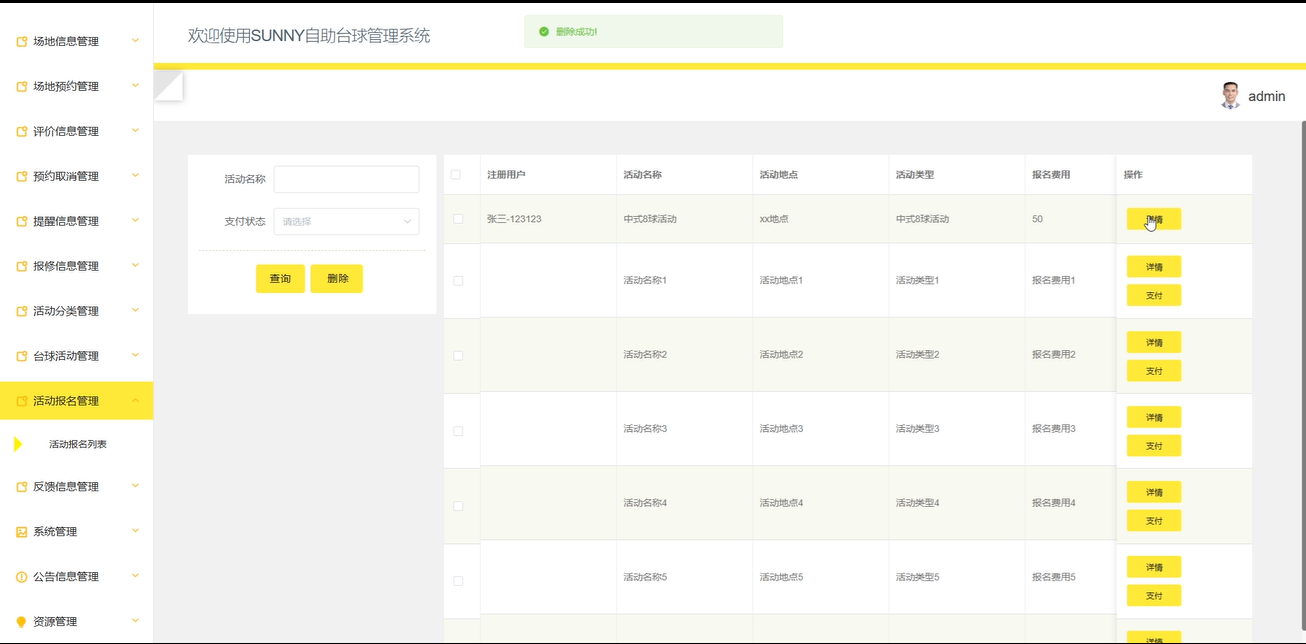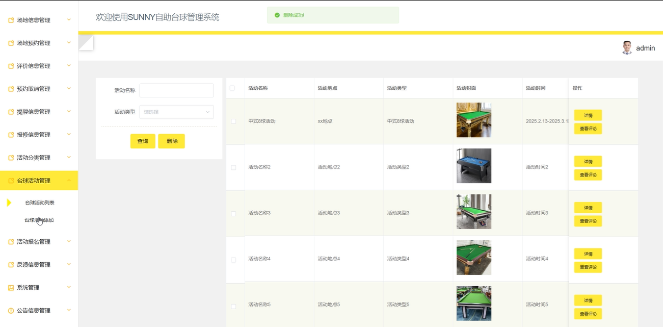 台球活动管理:管理员可以查看台球活动详情和用户评论,支持输入活动名称、选择活动类型进行搜索、查询和删除;可以添加新活动信息,丰富活动内容。