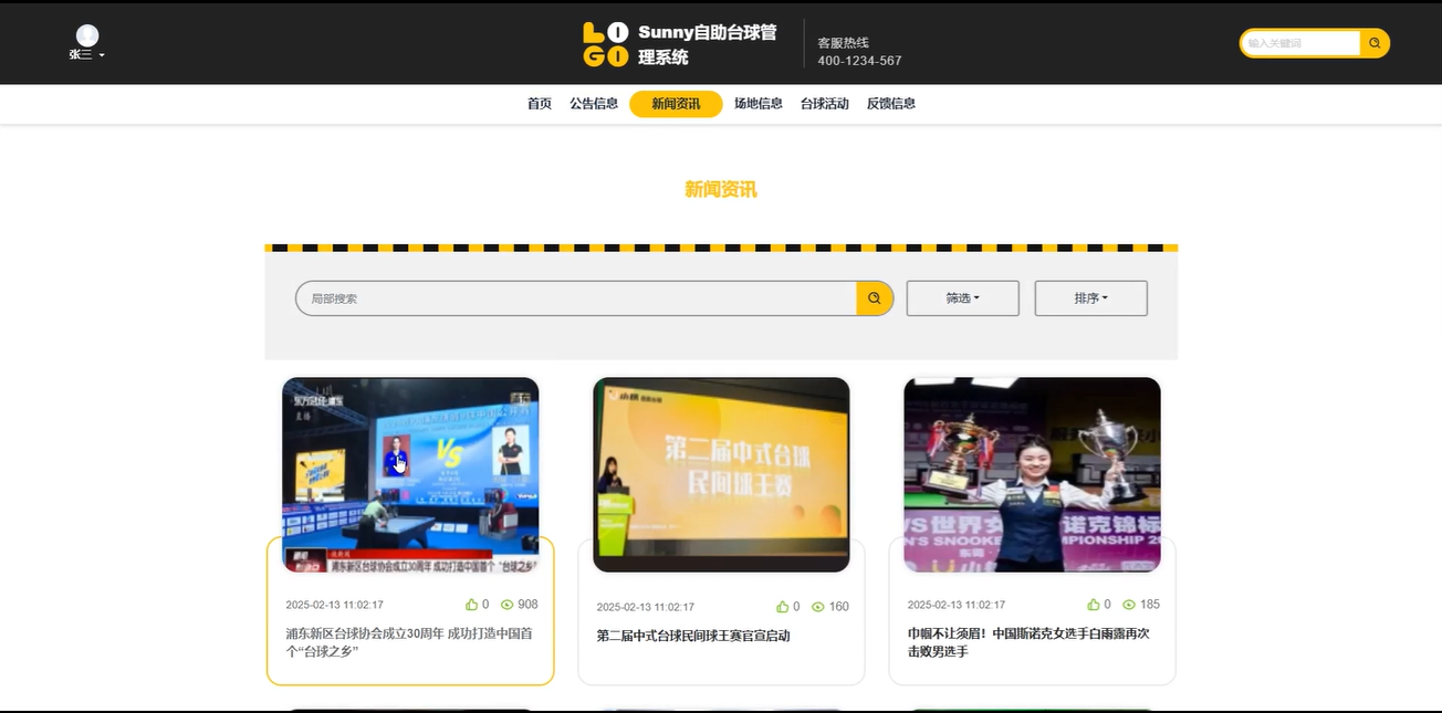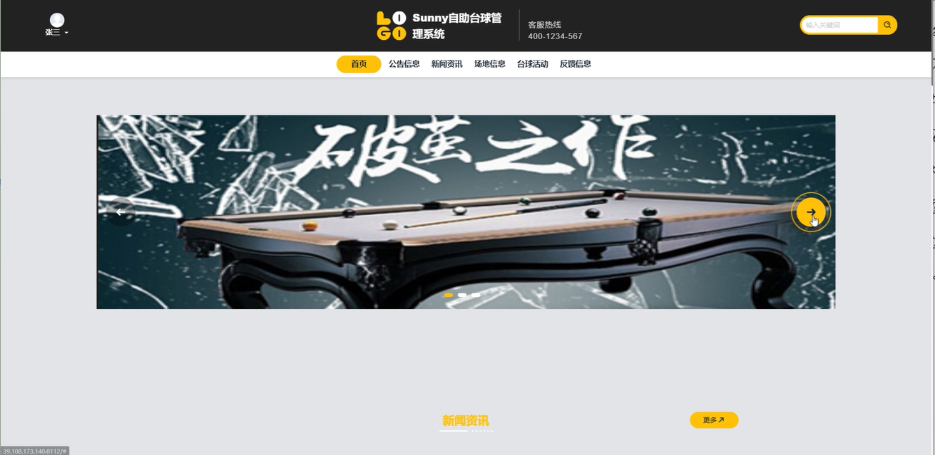 首页:用户可以操作导航栏查看轮播图、公告消息、新闻资讯、场地信息推荐、台球活动及反馈信息等内容。支持通过输入关键词进行全网搜索,并对我的账户资料进行修改。此外,系统会根据用户的浏览历史推荐相关内容。