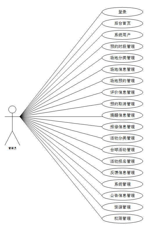 在Sunny自助台球管理系统中,管理员的主要功能是管理系统内的用户、场地、活动和反馈信息。管理员可以审核用户注册信息,确保用户资料的合法性与准确性。同时,管理员负责管理场地预约信息,设置场地的开放时间和预约时段,确保场地资源的合理分配。管理员还需安排和管理台球活动,包括活动的创建、修改和删除,并根据用户需求调整活动内容。此外,管理员能够查看用户反馈、评论以及报修信息,及时处理问题,确保用户满意度。通过这一系列功能,管理员能够高效地运营和维护台球场馆的日常管理工作,提升平台的服务质量。详细用例图如图3-2所示。