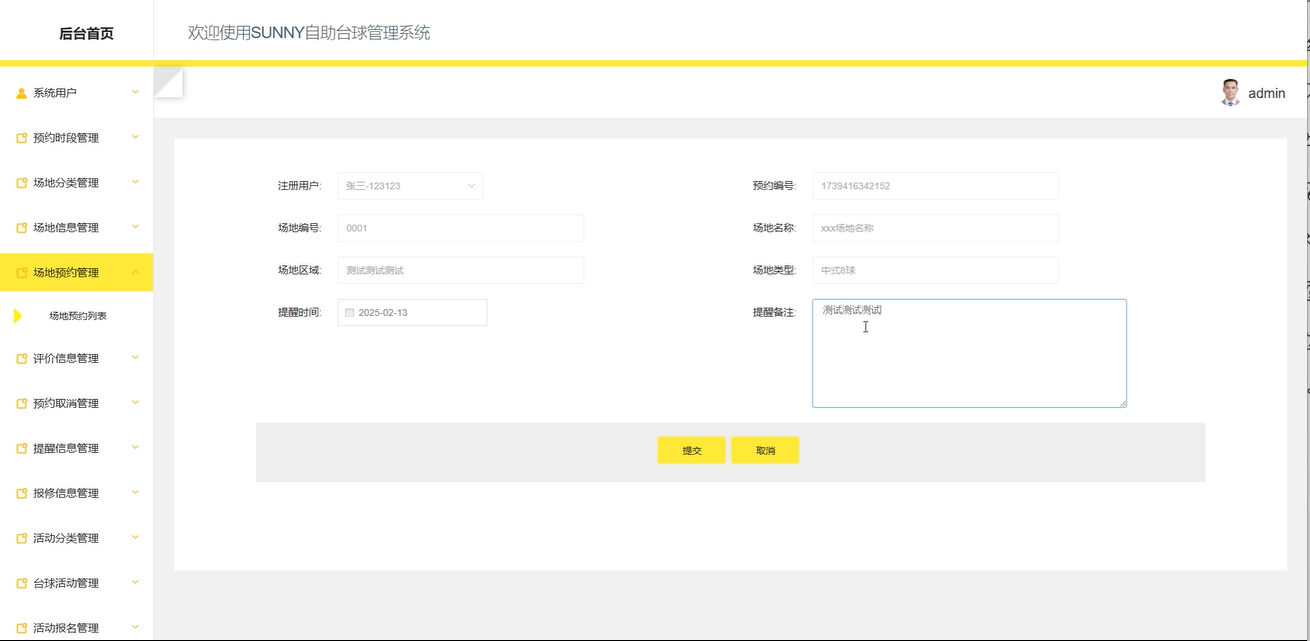 提醒信息管理:管理员可以查看提醒信息详情,支持输入场地名称、场地类型进行搜索、查询和删除,确保提醒机制的有效性。