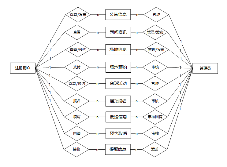 Sunny自助台球管理系统的总体功能需求主要围绕提高台球场馆管理效率和优化用户体验展开。系统需提供两个主要角色功能:注册用户和管理员。注册用户能够浏览场地信息、查看台球活动、进行在线预约、报名活动、提交反馈及管理个人账户。同时,系统支持评论、收藏、场地评价等互动功能,方便用户进行个性化管理。管理员则主要负责系统数据的后台管理,包括审核用户账号、管理场地信息、设置预约时段、处理用户反馈及活动安排等。管理员还需具备查看统计数据、优化场馆资源利用的能力,确保平台运营的高效性。整体系统设计要求简洁、智能,旨在为用户和管理员提供一个便捷、高效的管理平台,提升台球场馆的服务质量和运营效益。