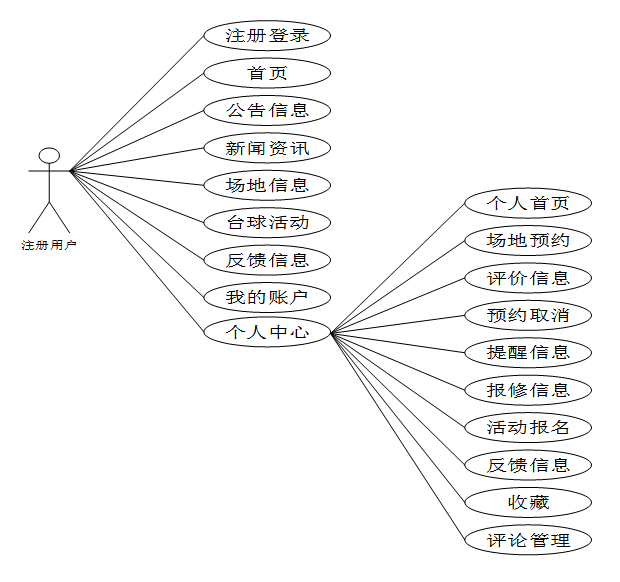 在Sunny自助台球管理系统中,注册用户的主要功能包括注册、登录、场地预约、活动报名以及个人信息管理。用户通过注册流程创建账户后,能够使用系统提供的各项功能,如浏览场地信息、查看台球活动安排,并进行在线预约或报名参与活动。注册用户可以在个人中心查看历史预约记录、活动参与情况以及管理个人资料,如修改密码、更新联系方式等。此外,用户还可以提交反馈和评价,参与场地和活动的评论互动。系统通过提供简洁的操作流程和丰富的功能选项,确保用户能够方便地管理自己的台球活动需求,提升使用体验。详细用例图如图3-1所示。