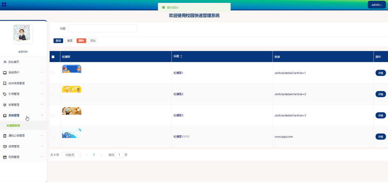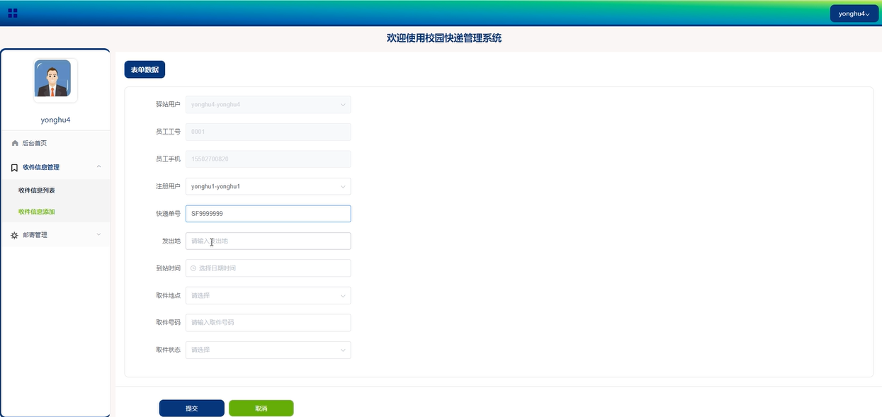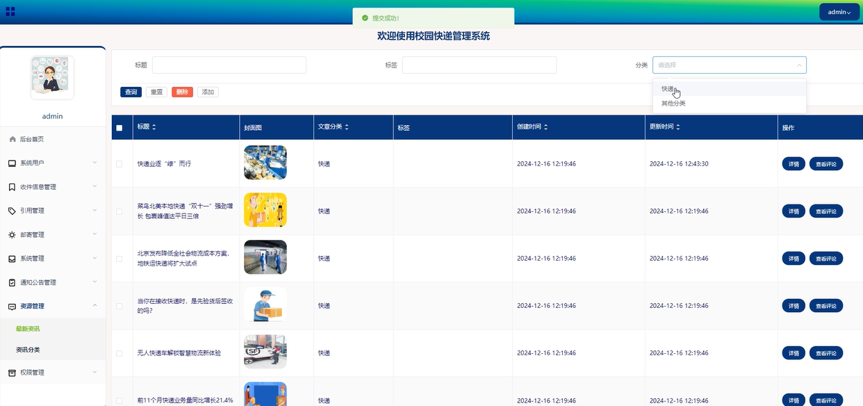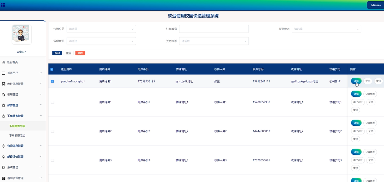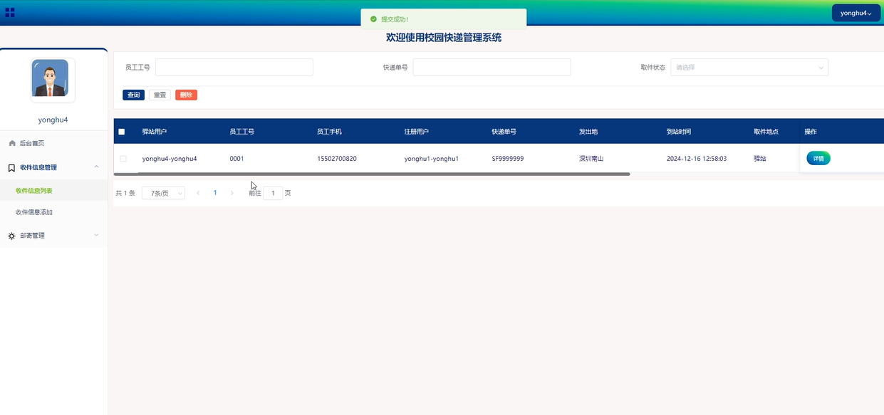 该系统已成功部署于某高校校园快递中心,显著提升了快递处理效率,降低了人工错误率,赢得了用户的广泛赞誉。展望未来,将持续优化系统功能,提高智能化水平,为校园快递管理提供更加高效、便捷的服务。