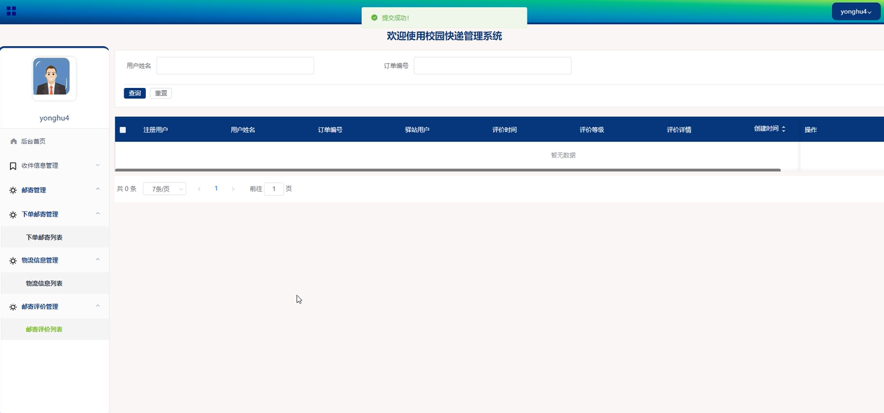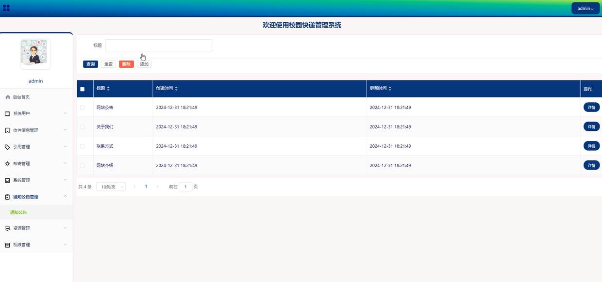 总体而言,该校园快递管理系统系统的成功实现,不仅为校园快递的管理提供了有力支持,也为其他类似管理需求的系统开发提供了实践依据,推动了校园快递管理的现代化与智能化发展。