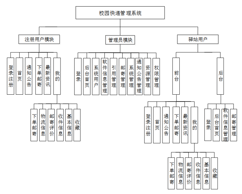 (3)在校园快递管理系统中,首先要确定系统的技术,然后进行在线确认,以确定系统的用户角色,并根据这些角色划分出相应的功能模块。系统的设计主要将用户分为管理员、注册用户角色和驿站用户角色,每个角色都有其独特的特点,而且每个功能模块都有其特定的功能,但是系统的数据库都是交互式的,用户可以随时根据自身的需求查看通知公告、最新资讯等内容,而驿站用户负责快递收发、信息录入及包裹管理等工作。管理员可以快速收集用户的详细信息,并能够在第一时间响应客户的需求。