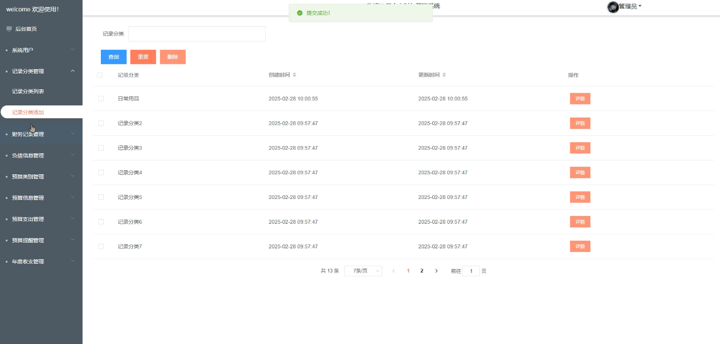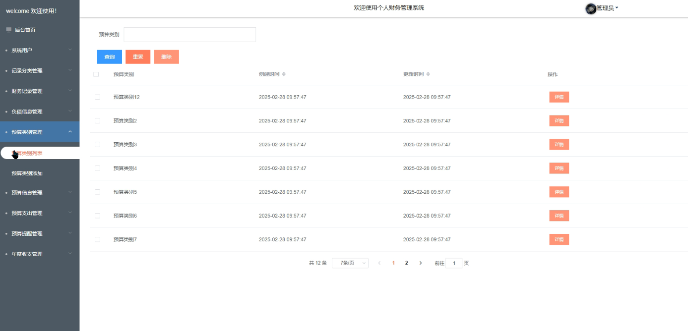 - 预算类别管理:在预算类别管理模块中,管理员可以添加新的预算类别、删除不再需要的类别以及查询特定类别的详细信息。