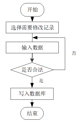 用户首先选择需要修改的记录,输入修改后的数据,系统判断输入数据是否合法。若数据不合法,提示重新输入,若数据合法,则将修改后的数据写入数据库,完成操作后流程结束。修改信息流程图如图3-7所示。
