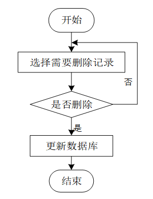用户选择需要删除的记录后,系统判断是否确认删除。若未确认,返回选择环节,若确认删除,则更新数据库,删除对应记录,完成操作后流程结束。删除信息流程图如图3-8所示。