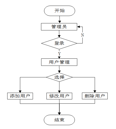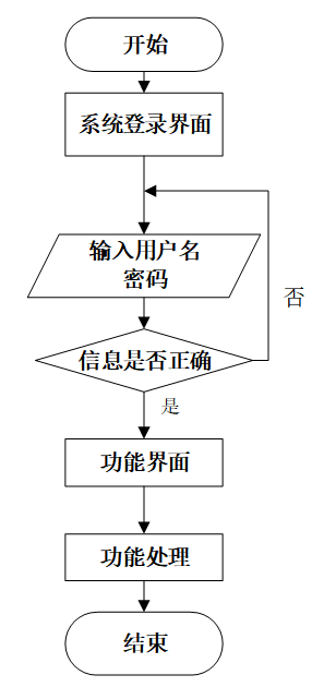 用户首先进入系统登录界面,输入用户名和密码后,系统验证信息是否正确。若验证失败,返回登录界面重新输入,若验证成功,则进入功能界面,执行相应功能处理后结束操作流程。操作流程如图3-5所示。