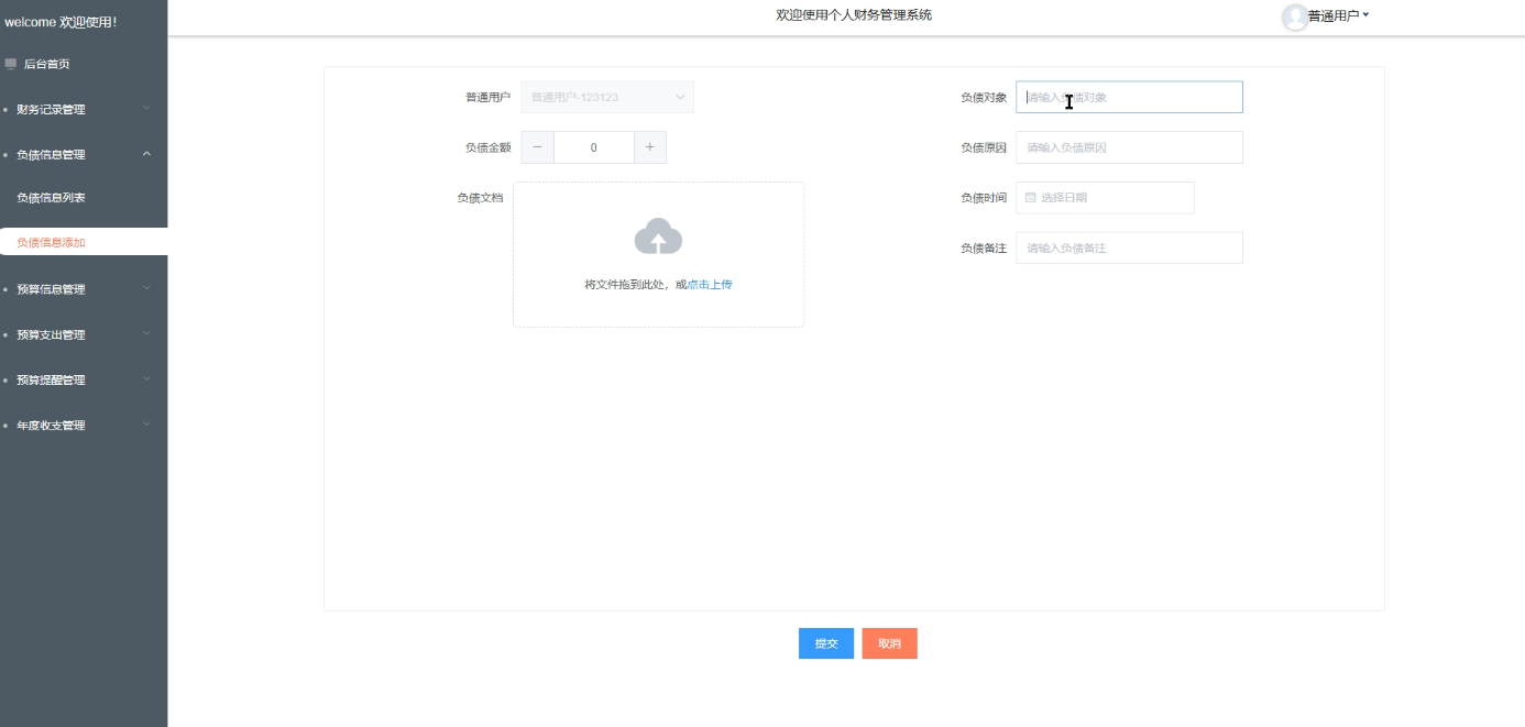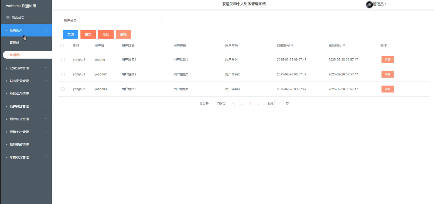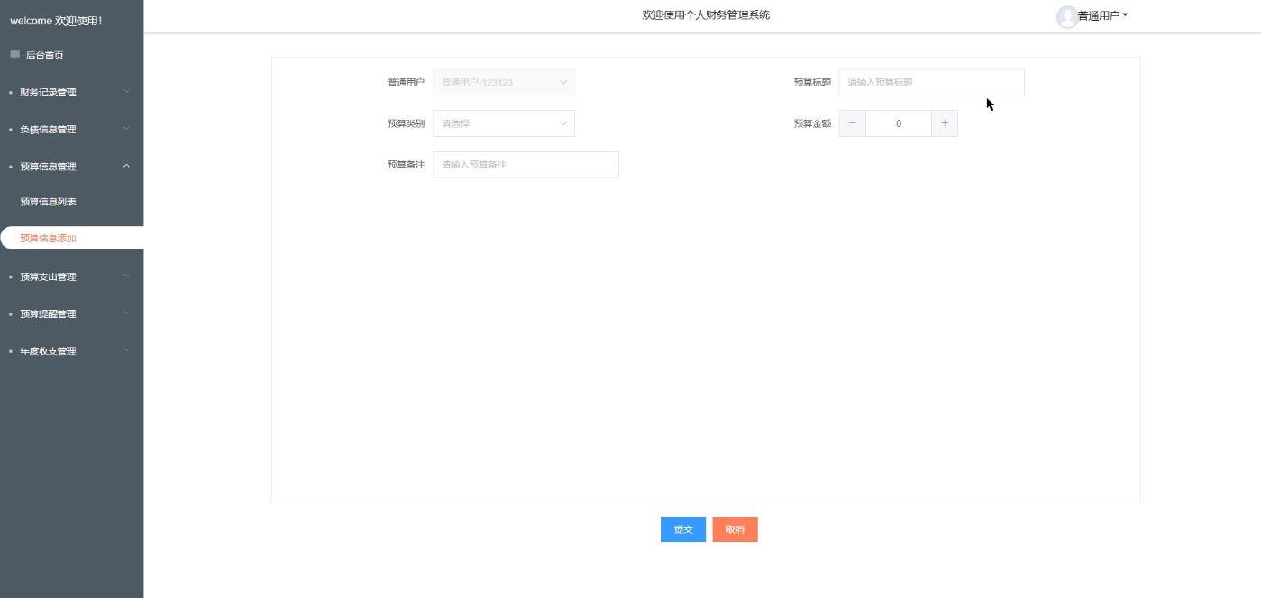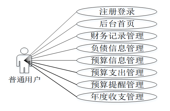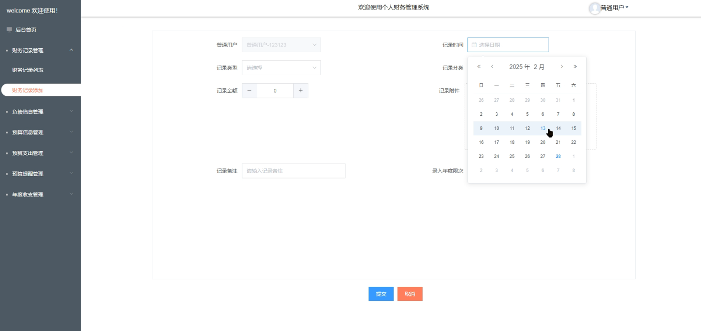 本系统通过实现用户权限管理、财务记录管理、预算管理及年度收支统计等核心模块,为用户提供了全面的财务管理功能[2]。普通用户可以通过简单的操作,轻松实现财务记录的添加、删除与查询,随时查看自己的负债信息、预算支出和提醒,还能方便地导出年度收支数据,为个人的财务规划提供有力支持[3]。而管理员则拥有更高的权限,可以全面管理系统用户、记录分类、预算类别等内容,确保系统的正常运行和数据的安全性。