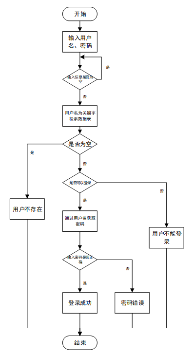 用户输入用户名和密码后,系统先检查输入是否为空,再验证用户名是否存在,若存在则通过用户名获取密码并校验。若密码正确则登录成功,否则提示密码错误。若用户名不存在或无法登录,提示用户操作无效。如图3-4所示。