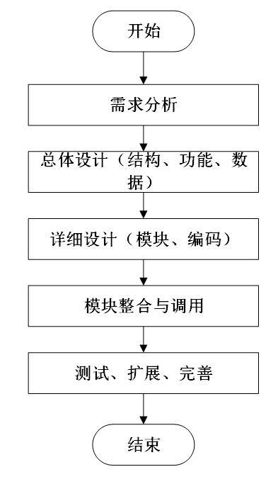 系统开发流程的主要步骤,从需求分析到系统完成的全过程。流程包括需求分析、总体设计(结构、功能、数据)、详细设计(模块、编码)、模块整合与调用,以及测试、扩展和完善,最终完成系统的开发。本系统的开发流程如图3-3所示