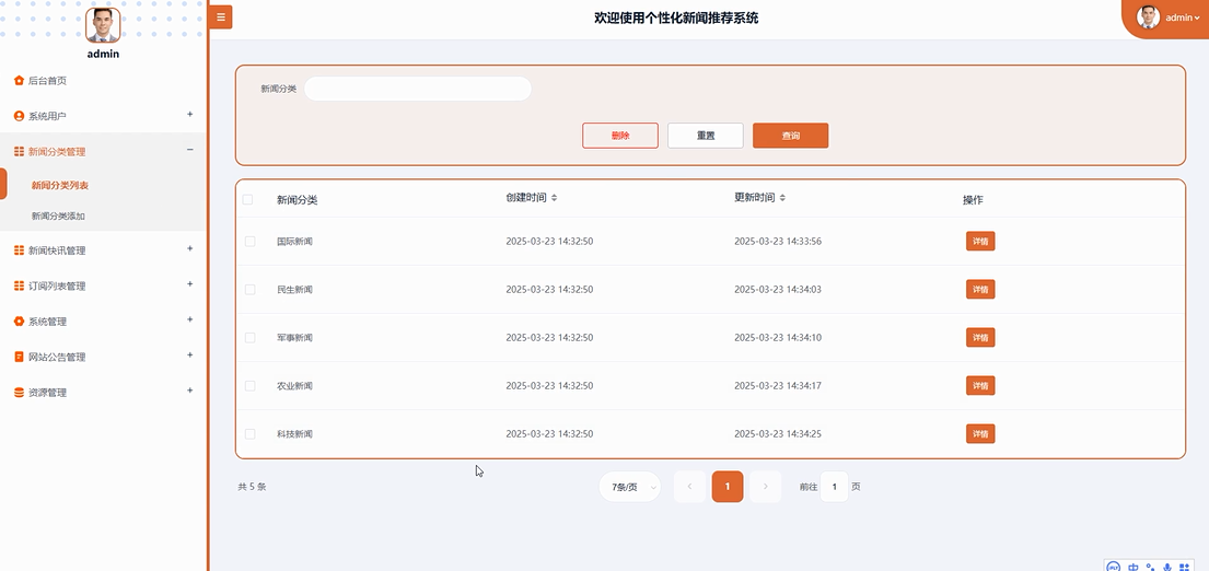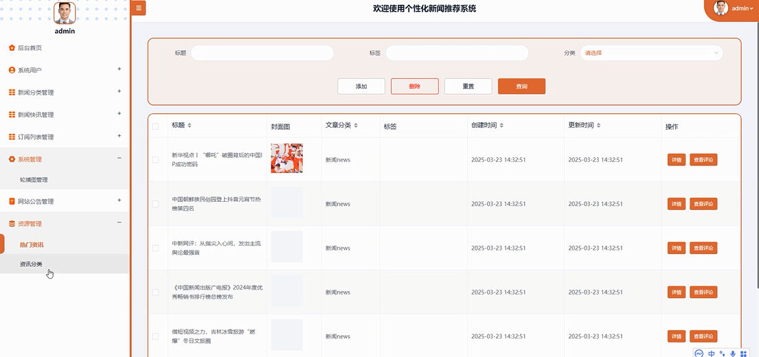资源管理:管理员在资源管理模块下,能够查询、删除和添加热门资讯以及资讯分类。通过这一功能,管理员可以确保平台上的新闻内容不断更新,且能够根据用户的需求进行优化分类。