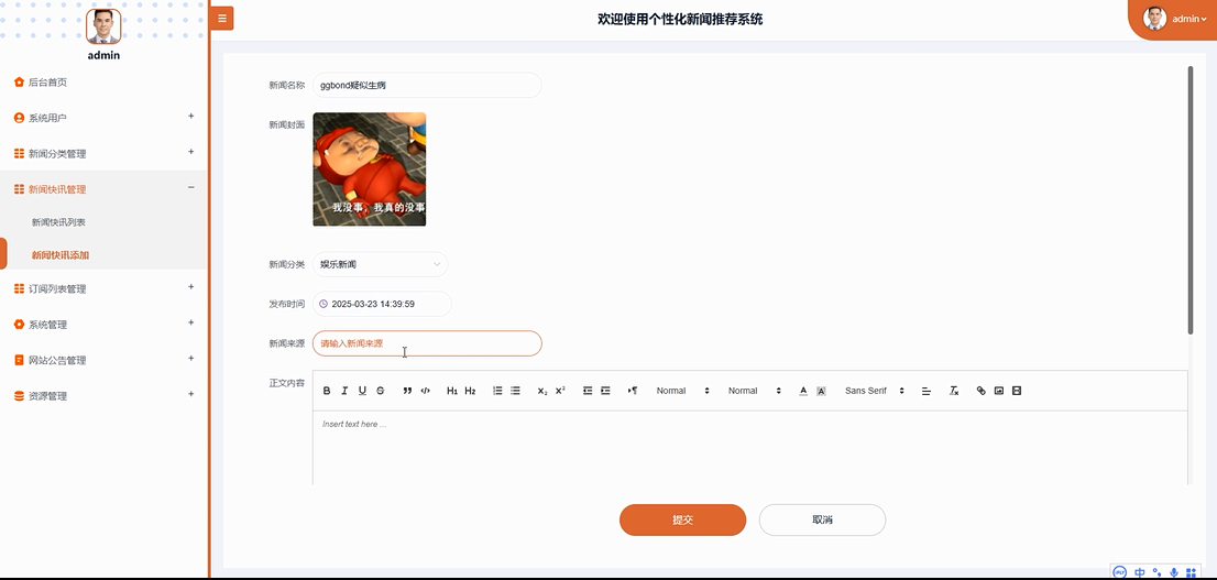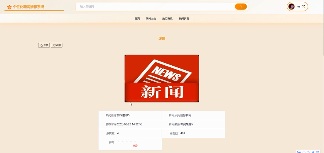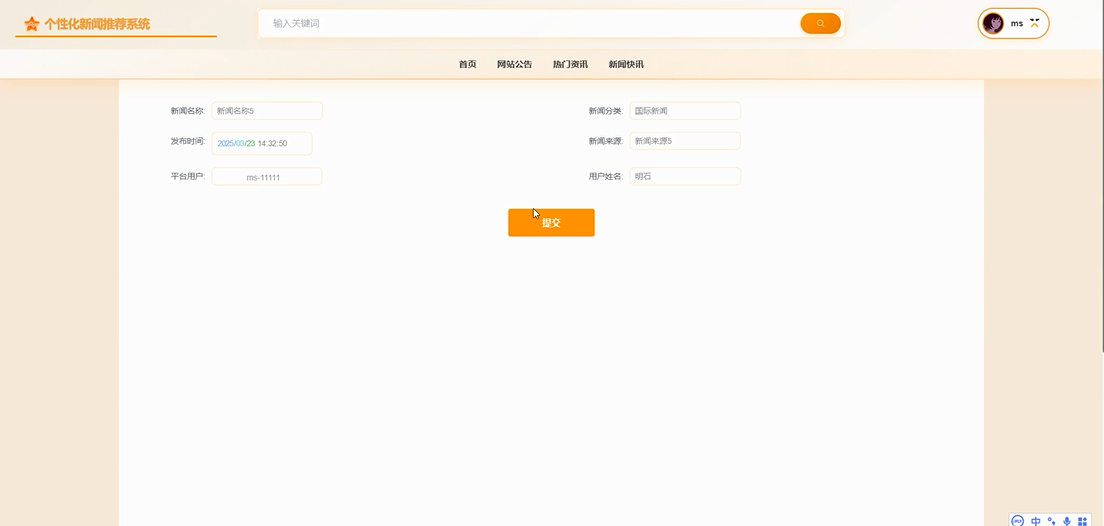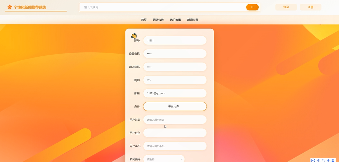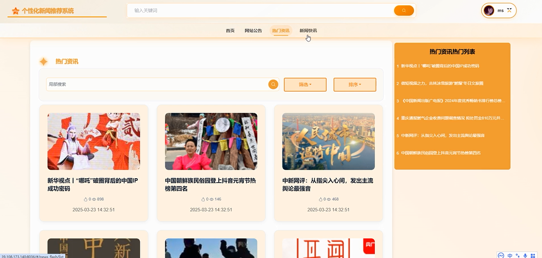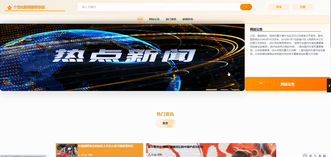 This system aims to provide users with a personalized news recommendation platform, using Python technology to design and develop various functional modules. After registering and logging in, users can browse news reels and popular information on the platform homepage, and like, bookmark, and comment based on their interests, forming personalized information preferences. The personal center provides detailed subscription lists, statistical charts, and comment management, making it convenient for users to track and adjust information reception settings. Administrators have the authority to manage news alerts, news categories, user subscriptions, and website announcements, ensuring timely updates and management of platform content.